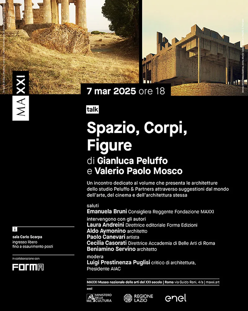 Venerdì 7 marzo, il MAXXI di Roma ospiterà gli architetti Gianluca Peluffo e Valerio Paolo Mosco, autori del volume "Spazio, corpi, figure. Peluffo & partners", da cui prende spunto l'incontro. Interverranno nel dibattito anche Laura Andreini direttrice editoriale Forma Edizioni, Aldo Aymonino, architetto, Paolo Canevari, artista, Cecilia Casorati, Direttrice Accademia di Belle Arti di Roma, Beniamino Servino, architetto e Luigi Prestinenza Puglisi, critico di architettura e Presidente AIAC.