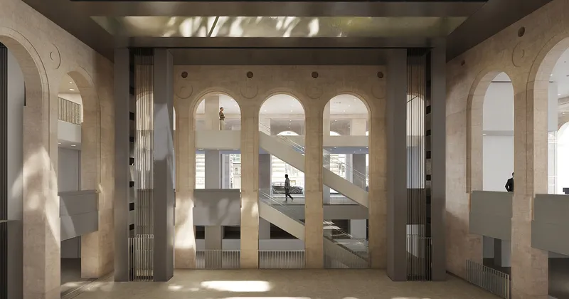 Vista del cantiere della futura sede della Fondation Cartier pour l'art contemporain, place du Palais-Royal, Parigi. Rendering della piattaforma 1 con vista su Rue de Rivoli © Jean Nouvel / ADAGP, Paris, 2024