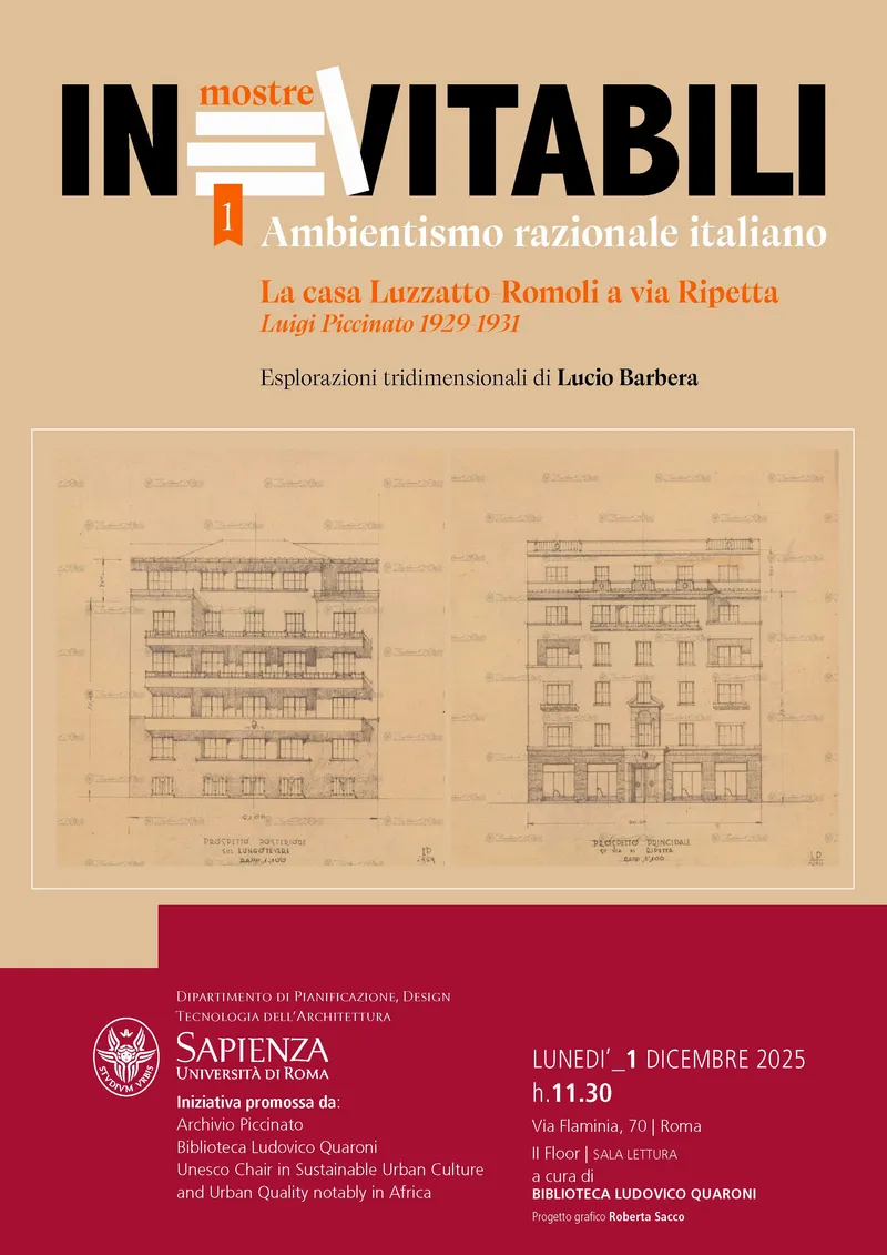 Lunedì 1 dicembre 2025 alle 11:30, Il Dipartimento di Pianificazione, Design e Tecnologia dell'Architettura della Sapienza Università di Roma inaugura il ciclo "Inevitabili mostre", con un appuntamento dedicato alla casa Luzzatto-Romoli in via Ripetta (1929-1931) di Luigi Piccinato e al tema dell'ambientismo razionale italiano.
