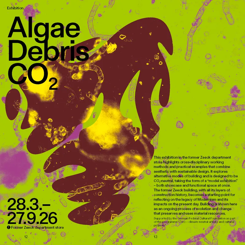 Alghe | Detriti | CO2. Allestita nell'ex grande magazzino Zeeck - inaugurato nel centro della città nel 1908, ampliato negli anni '20 e attualmente in cerca di nuova destinazione dopo essere rimasto vuoto per due decenni - la mostra, partendo dal presente prova a delineare scenari per il futuro, concentrandosi sui cicli produttivi, sulle risorse organiche, sul riuso, sulla valorizzazione e le nuove sperimentazioni con i materiali. Parte del Programma Zero, sostenuto dalla Fondazione Culturale Federale Tedesca con l'obiettivo di realizzare un'esposizione a impatto zero - riflette sulla responsabilità condivisa per il nostro ambiente ed esemplifica come il design possa contribuire a realizzare un cambiamento sociale. Vengono infatti presentate alternative nei settori del cemento, dell'acciaio e del vetro, oltre a materie prime rinnovabili, materiali di origine antropica, concetti e pratiche di conservazione e manutenzione.