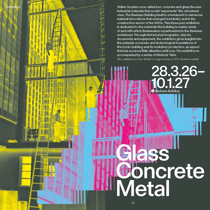 Vetro | Cemento | Metallo. Gli stretti legami tra il lavoro al Bauhaus e la storia industriale dei primi del Novecento sono il tema della mostra in tre parti Vetro | Cemento | Metallo ospitata nell'ala storica dei laboratori. La mostra, esplora le basi materiali, economiche e tecniche dell'edificio icona del modernismo - dal 1996 sito Patrimonio UNESCO, ma all'epoca fabbricato sperimentale - e della sua produzione nei laboratori, finora poco considerate nella storia e nella ricezione del Bauhaus. Si interroga sui formati di questa estetica moderna del quotidiano, sui processi e i luoghi di produzione, sulle condizioni di lavoro e sull'approvvigionamento delle materie prime che si celano dietro le superfici lisce e pulite di tubi d'acciaio e facciate di vetro. Ripercorre le rotte commerciali, le catene di approvvigionamento e i flussi di risorse intrecciati con le condizioni profondamente ineguali dell'economia e della geopolitica coloniale e imperiale, affrontandone frustrazioni e sconvolgimenti, ma anche le rivoluzioni associate alle innovazioni dei primi anni Venti. Questo tema, finora poco trattato negli studi sul Bauhaus, è anche di grande attualità e si collega ai dibattiti in corso sulla scarsità di materie prime ed energia, l'esaurimento delle risorse, la crisi climatica e l'imminente minaccia del commercio.
