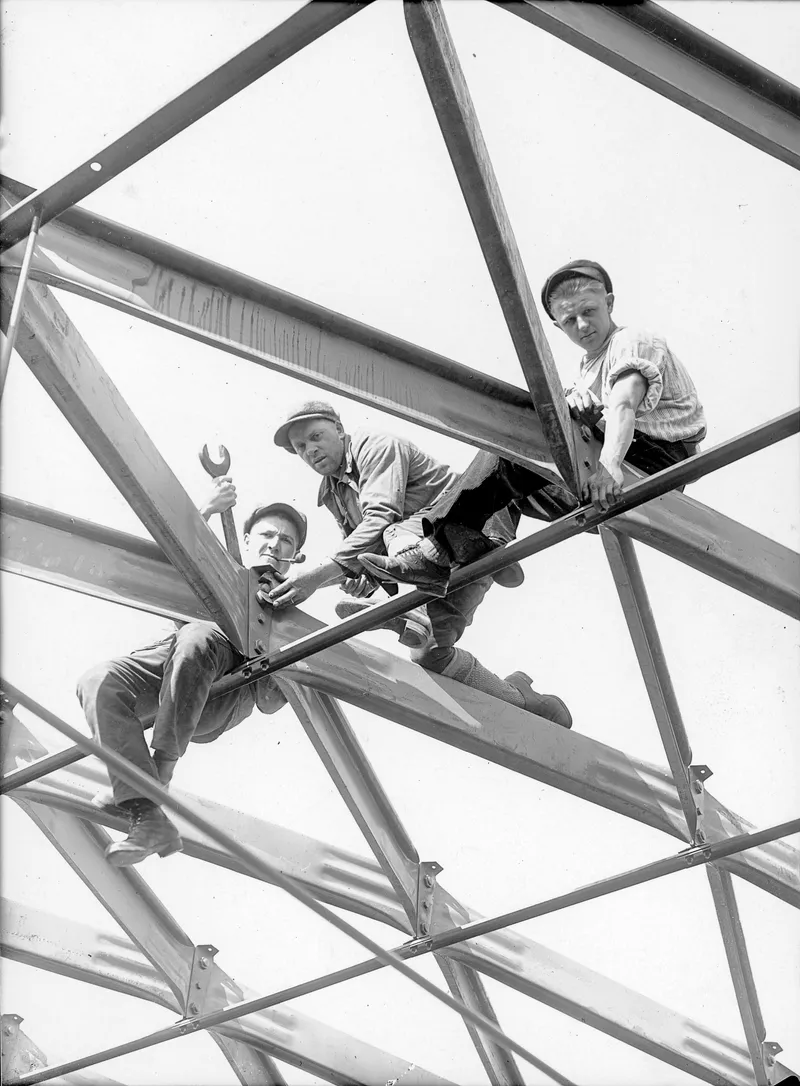 Montage des Daches der Turnhalle der Grundschule Dessau-Ziebigk in Junkers-Lamellenbauweise (1945 zerstört), Aufnahme: 1928 © Stadtarchiv Dessau-Roßlau