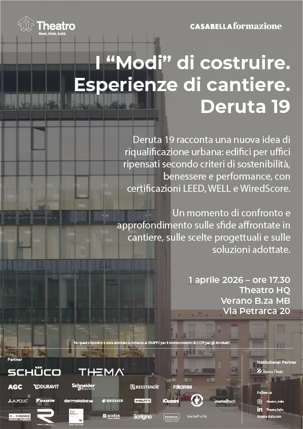 Protagonista della serata è Deruta 19, intervento di rigenerazione di due edifici per uffici a Milano firmato Coima Image: un caso studio in cui il ripensamento architettonico e funzionale si è misurato con i temi della sostenibilità, efficienza energetica e qualità costruttiva.