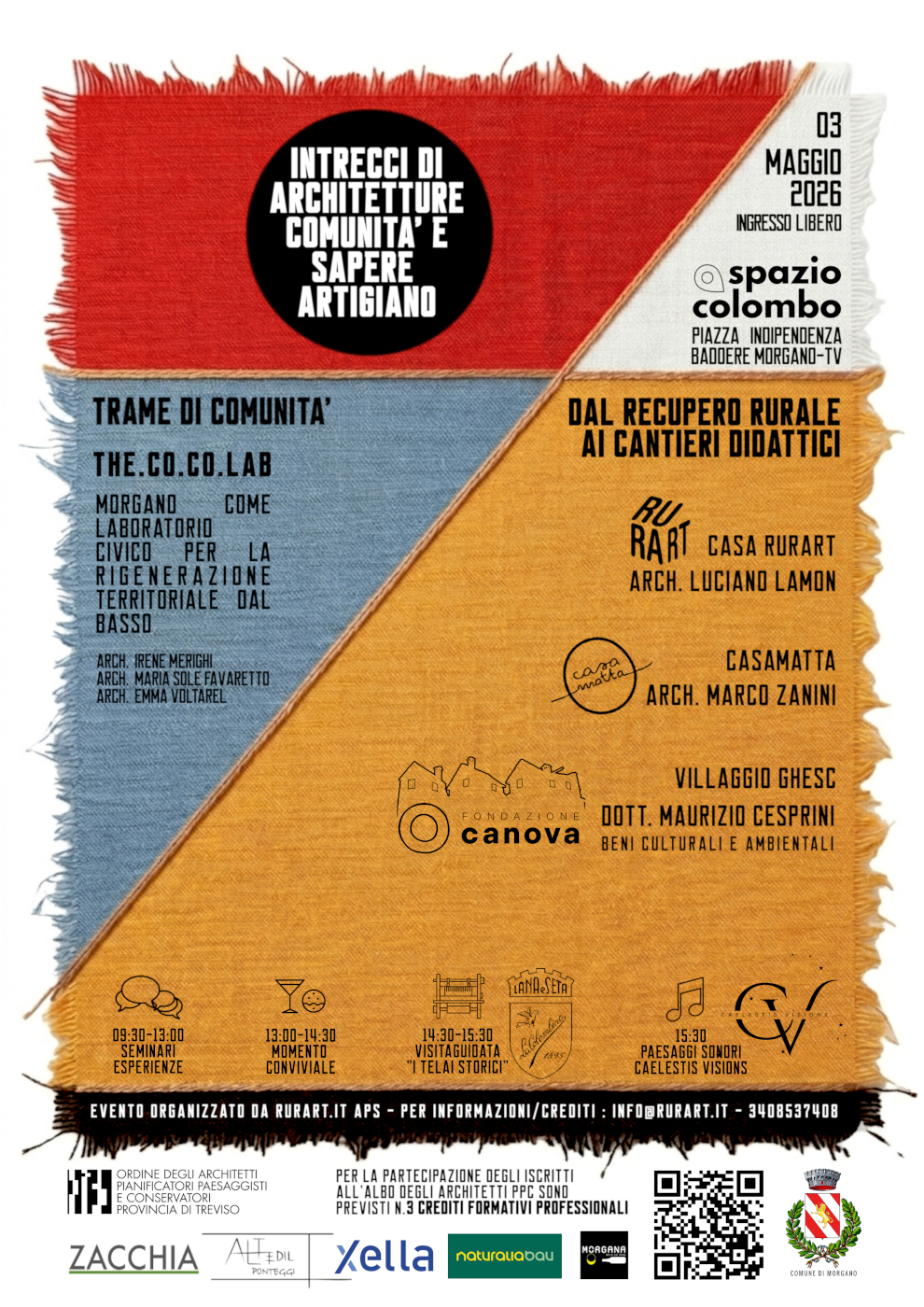 Un'intera giornata dedicata al rapporto tra architettura, comunità e saperi artigiani: è questo il tema di "Intrecci di Architetture, Comunità e Sapere Artigiano", l'evento organizzato da RurART.it APS per la giornata di domenica 3 maggio, ospitato nello SPAZIO COLOMBO, all'interno dell'azienda storica La Colombina, a Badoere di Morgano (TV).