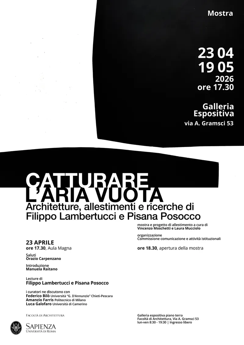 Dal 23 aprile al 19 maggio 2026, la sede di Valle Giulia della Facoltà di Architettura della Sapienza Università di Roma ospita la mostra "Catturare l'aria vuota. Architetture, allestimenti e ricerche di Filippo Lambertucci e Pisana Posocco", che presenta una selezione di progetti e sperimentazioni realizzati in oltre trent'anni di attività dei due progettisti.