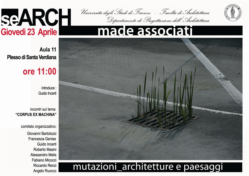 Incontro con lo studio di progettazione MADE Associati. Si tratta del terzo appuntamento del ciclo di incontri dal titolo "corpus ex-machina" previsto dal progetto SeARCH del Dipartimento di Progettazione della Facoltà Architettura di Firenze.