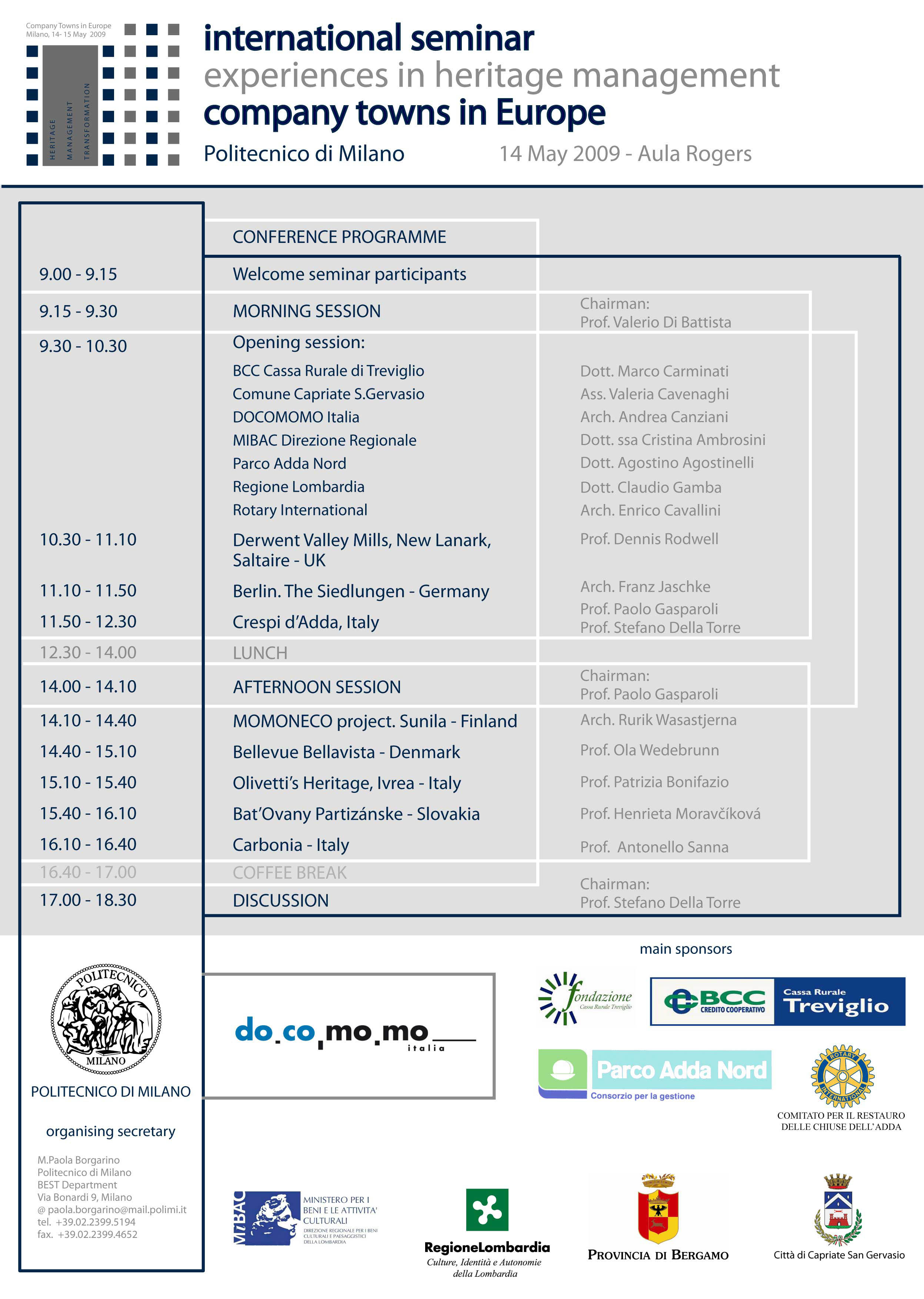 Seminario organizzato dal dipartimento BEST- Building Environment Science & Technology del Politecnico di Milano con Docomomo - associazione internazionale che si occupa di restauro dell'architettura moderna. Gli eventi sono organizzati nell'ambito delle attività che il gruppo di ricerca sta conducendo sul tema della riqualificazione del Villaggio Operaio di Crespi d'Adda, sito UNESCO dal 1995.