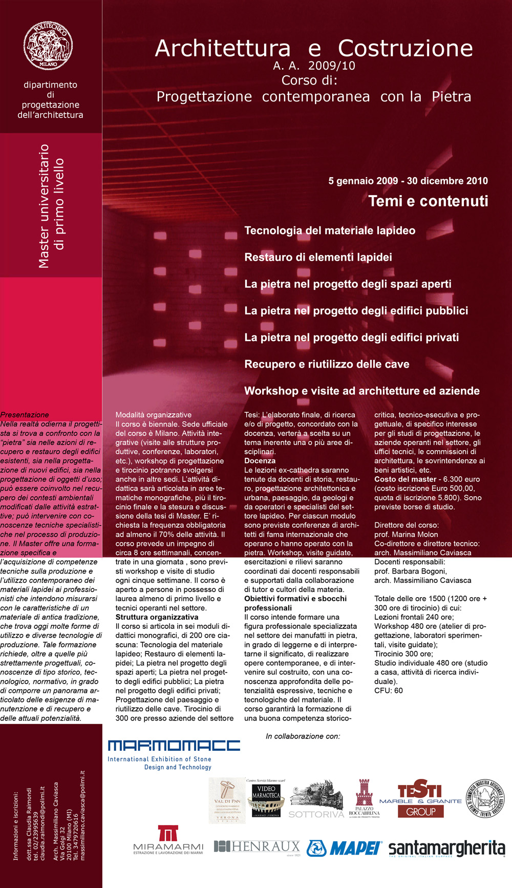 IL MASTER (link) - organizzato dal Dipartimento di Progettazione dell'Architettura della facoltà di Architettura e Società del Politecnico di Milano, fortemente voluto da Marmomacc - Veronafiere, si tratta del primo Master al mondo che si occupa della pietra dal punto di vista del progetto, non più materiale antico ma strumento d'innovazione progettuale, sperimentazione, espressione compositive e culturale.