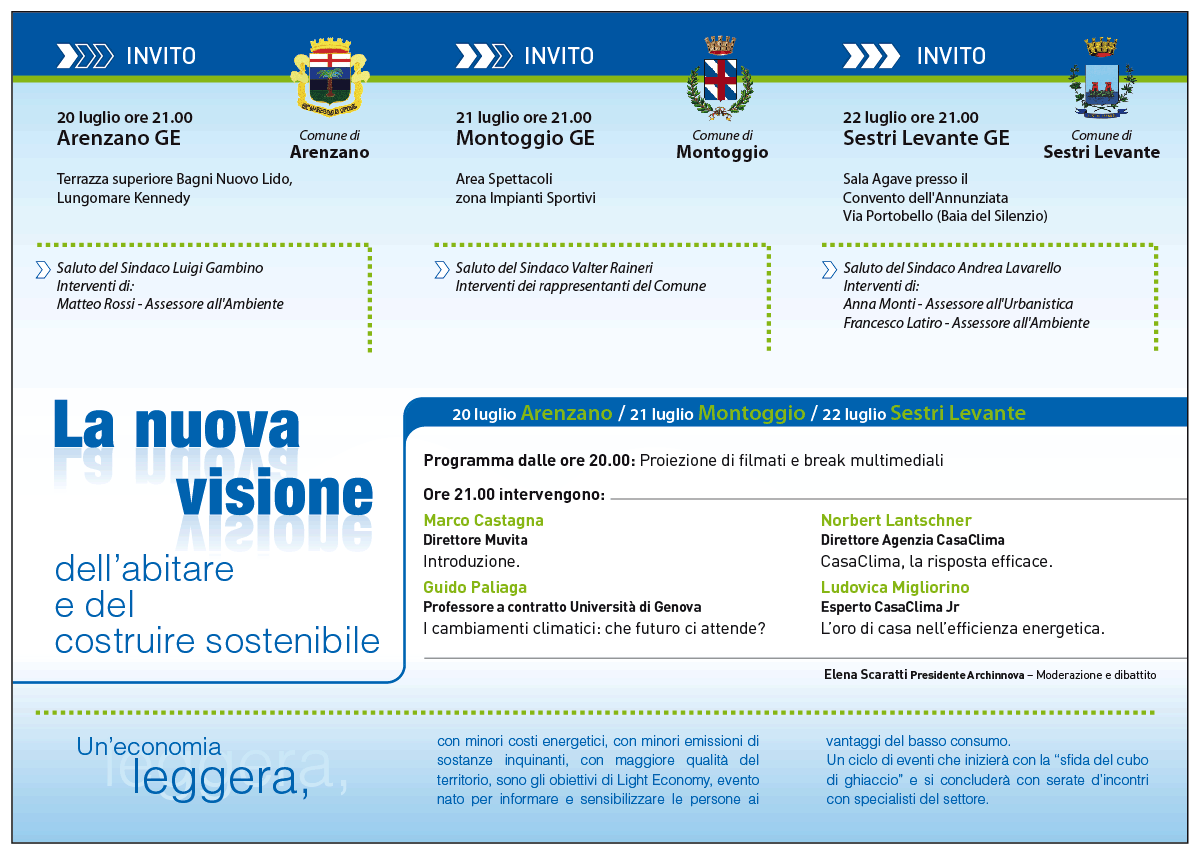 Light Economy proseguirà successivamente con un ciclo di tre incontri serali a Arenzano, Montoggio e Sestri Levante che vedranno la partecipazione di Norbert Lantschner, ideatore di CasaClima, di Marco Castagna, Direttore di Muvita e di altri relatori che tratteranno i temi del risparmio energetico tra le mura domestiche, con l'obiettivo di aiutare il grande pubblico a meglio comprendere le problematiche generali collegate a tale tematica e fornire anche suggerimenti utili e pratici.