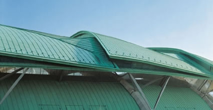 Per il progetto si sono utilizzati soltanto materiali naturali e durevoli nel tempo. La copertura, ad esempio, di dimensioni davvero imponenti, è stata interamente realizzata in rame pre-patinato TECU ® Patina.