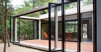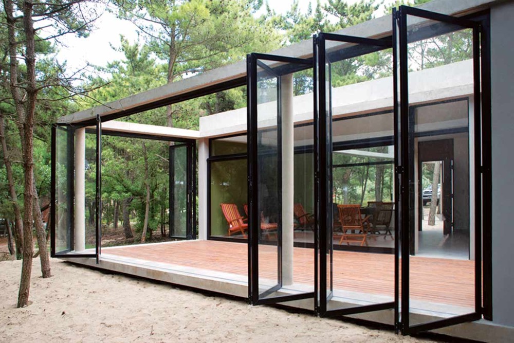 Estos espacios libres son contenidos por portones corredizos y plegables que permiten abrir y cerrar la vivienda según el momento del día o el uso que sea necesario, alterando de esta forma la espacialidad vivencial, sin perder relación con el particular entorno verde del terreno.