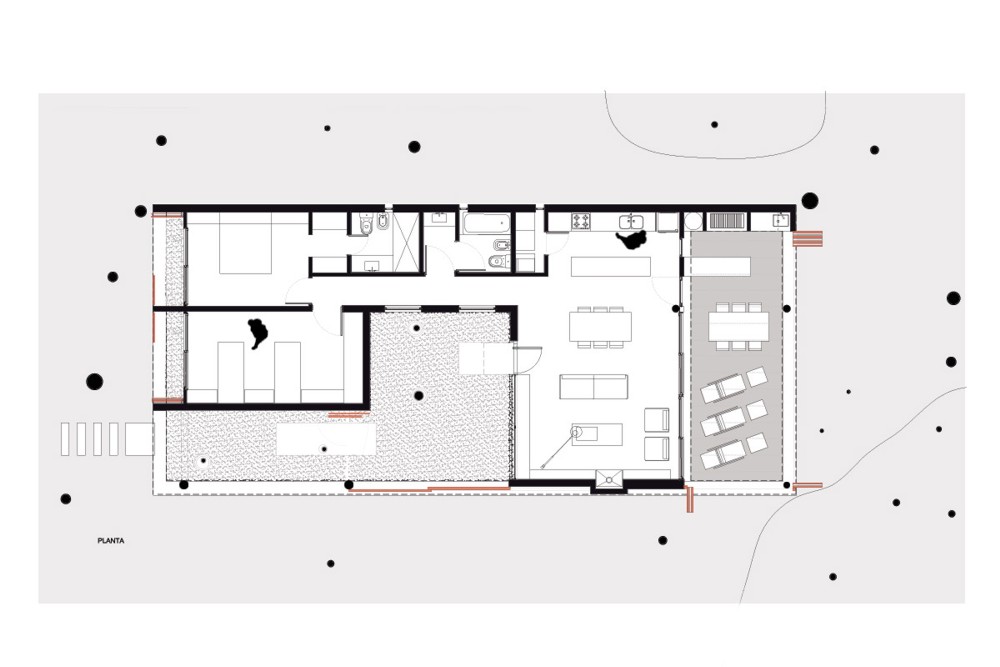 Una casa para ser usada durante gran parte del año, durante los fines de semana, la misma debía contar con dos dormitorios y dos baños, uno de ellos en suite, con la particularidad de que el área social debía tener dimensiones generosas. Por otro lado la casa debía cumplir condiciones de seguridad y relación con el paisaje verde del terreno.