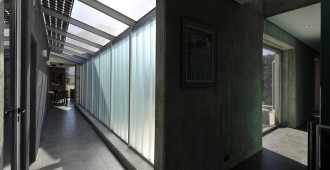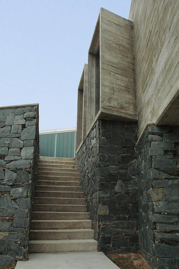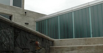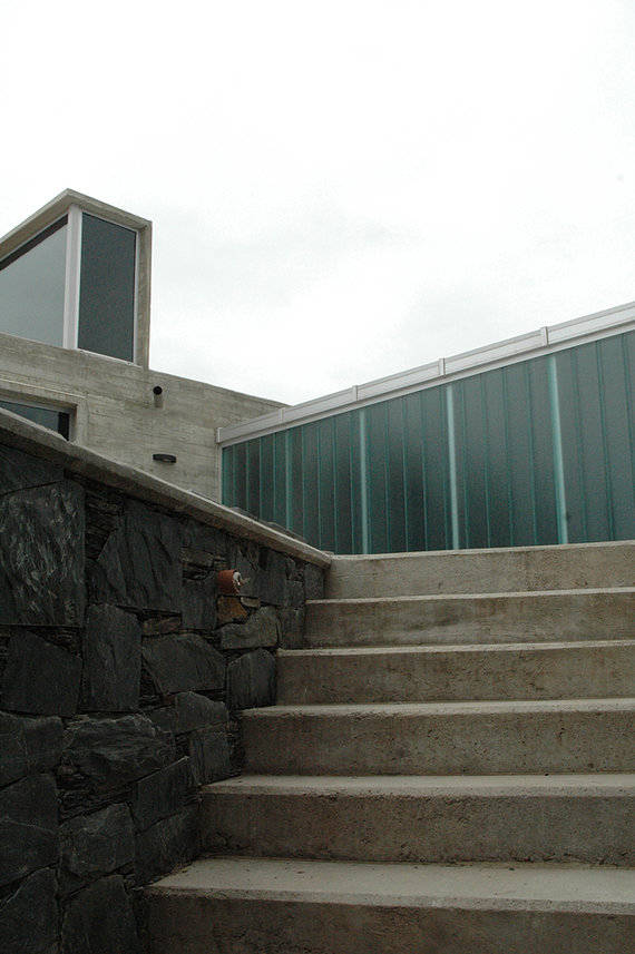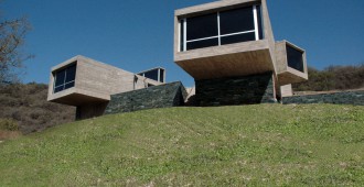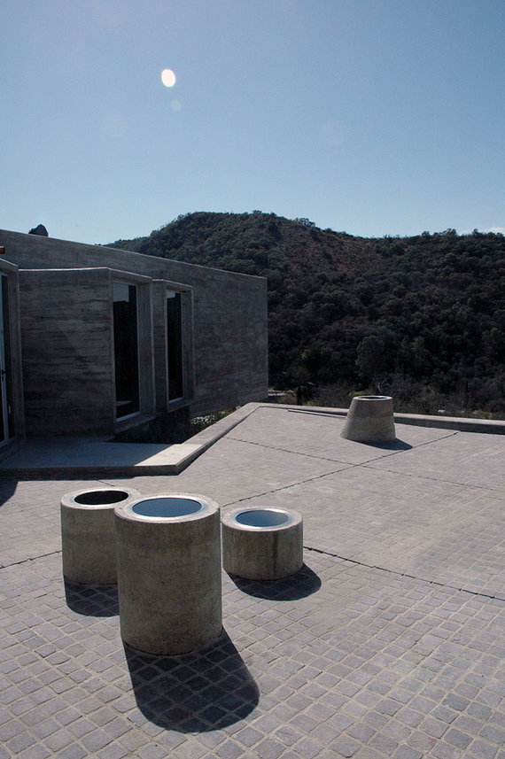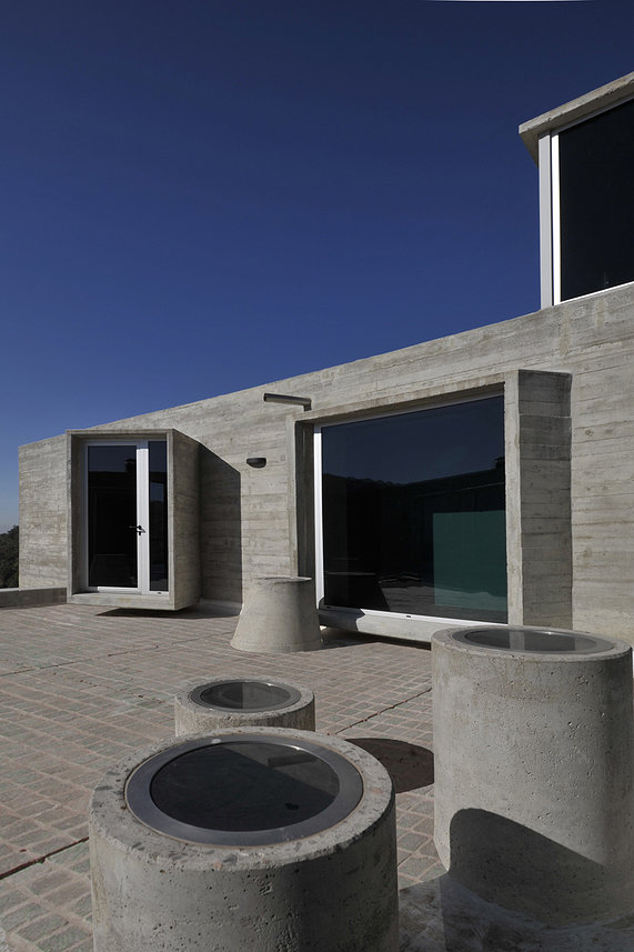 Estas ventanas catalejos abren ventanas hacia el valle, abajo y, hacia la geografía de montes a los costados. Emergen de dos potentes tubos que articulan las partes públicas una y, las privadas el otro, definiendo un patio entre ellos, terraza interior descubierta, abierta al paisaje global.