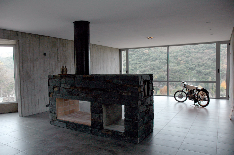La casa se apoya en la gran masa de un espacio único de trabajo-taller, colección de motos, cochera y acceso inferior.