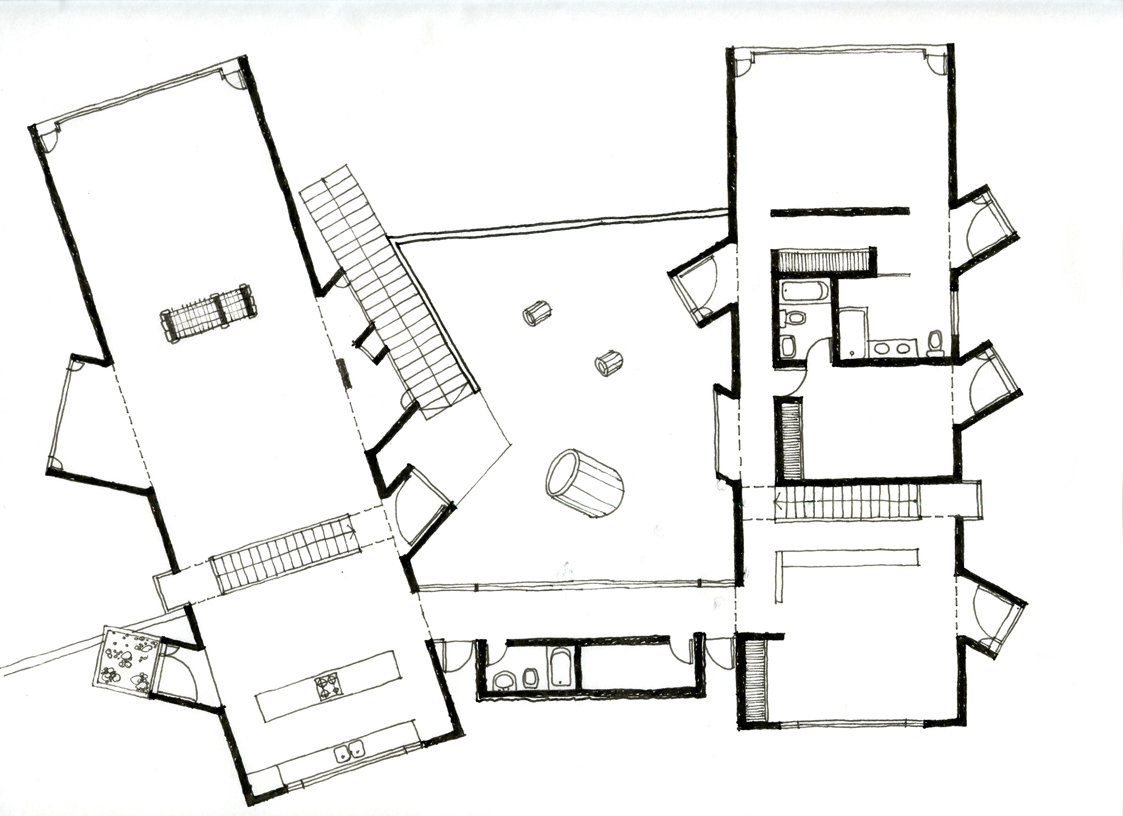 Esta particularidad va a generar ventanas catalejos mirando al norte, este y oeste enclavando la masa de la casa en la ladera, hacia el sur.