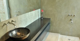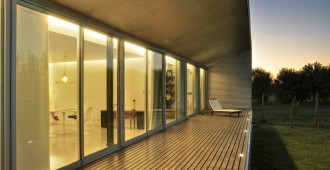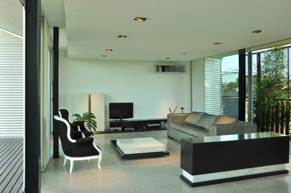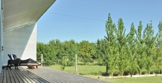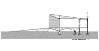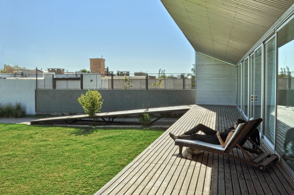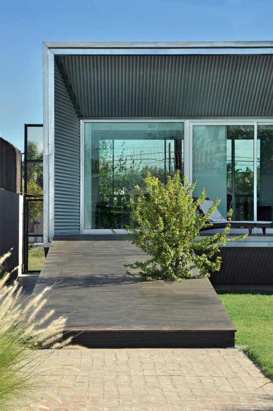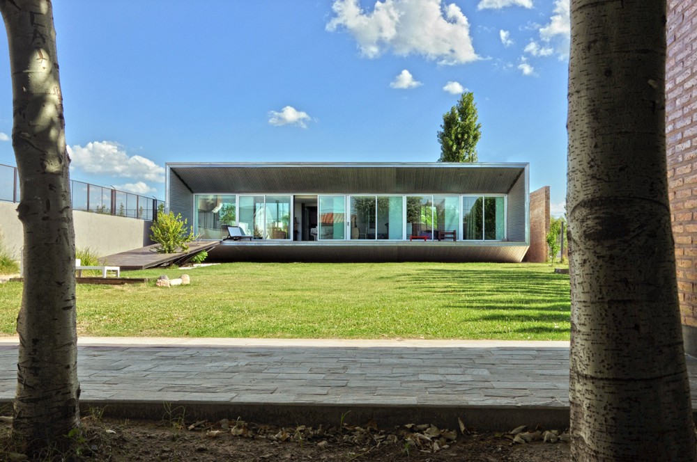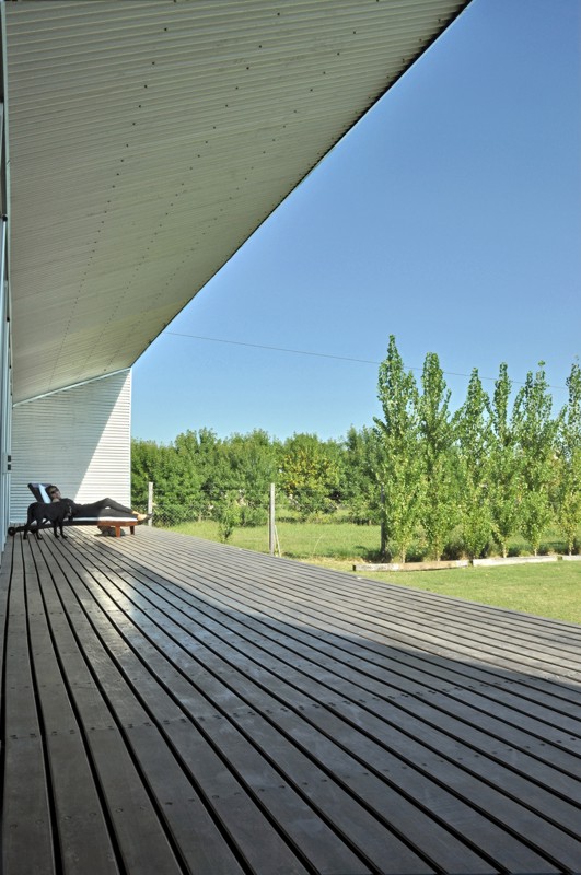 Toda la casa está elevada 1.20mts. del terreno natural, dado que las napas de agua están muy cerca de la superficie y en épocas de lluvia se anega el predio fácilmente, esta situación de altura permite tener una perspectiva abarcadora del jardín y el futuro bosque de acceso, además de captar las brisas sur norte para ventilación cruzada en todos los ámbitos de la vivienda.