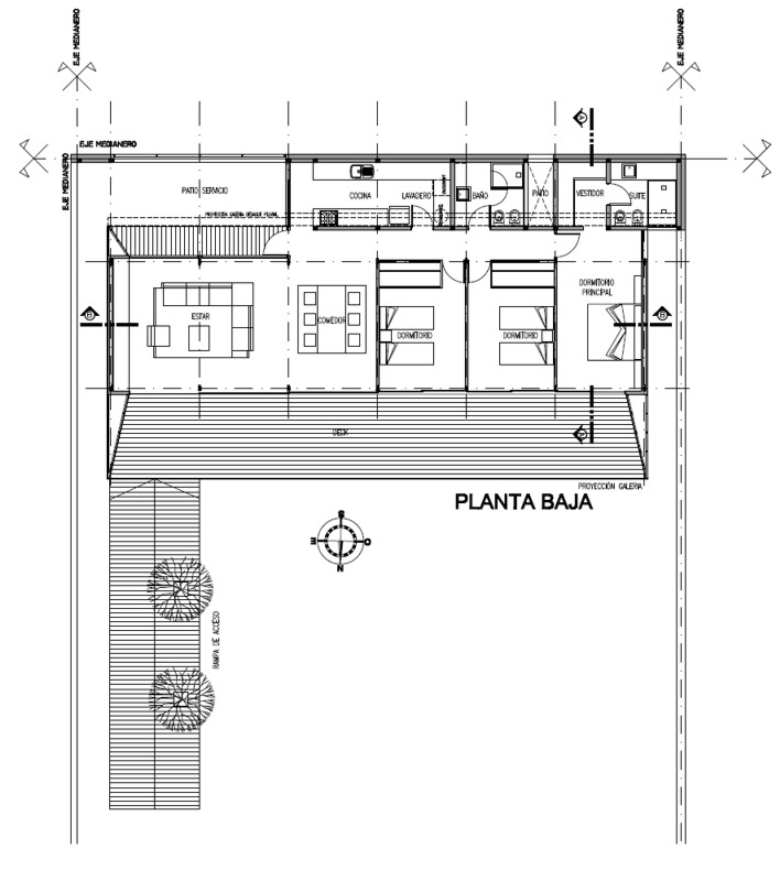 Es por ello que la casa se ubica en el extremo sur de la parcela, aprovechando la disposición longitudinal del terreno de 21.40m de frente por 45m de profundidad, colindando en ese límite con un extenso parque público.