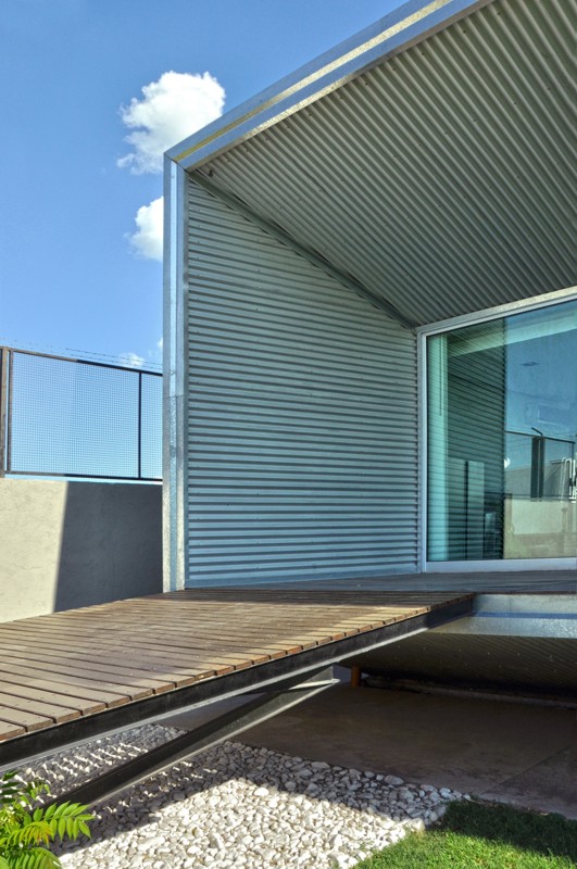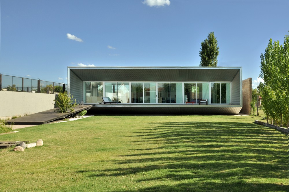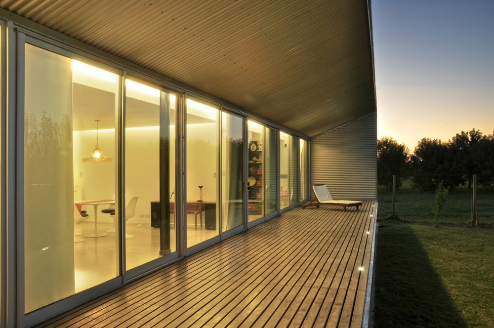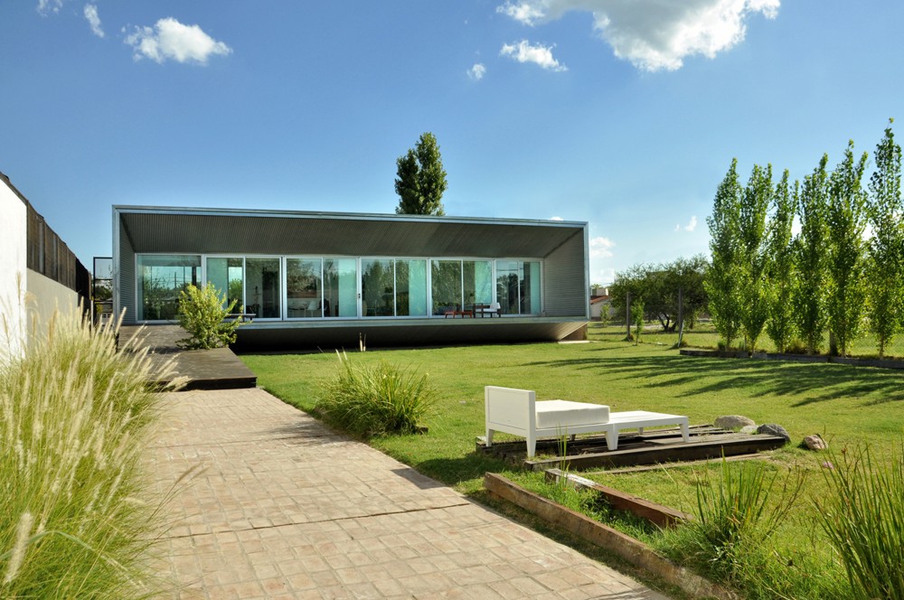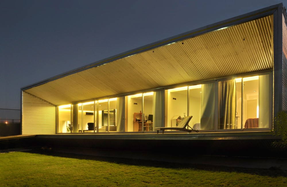 La casa se compone a partir de dos prismas, uno claramente de servicios, construido con ladrillo visto con junta rasada hacia el exterior, dónde se ubican la cocina, baños y vestidores y otro principal de mayor altura, realizado con una estructura metálica de perfiles IPN Nº 10, con una piel de chapa galvanizada dónde se alojan el estar y tres dormitorios. Todas estas estancias dan directamente a una galería amplia con orientación norte.