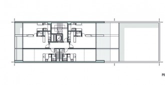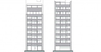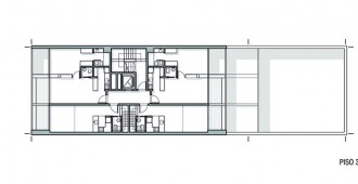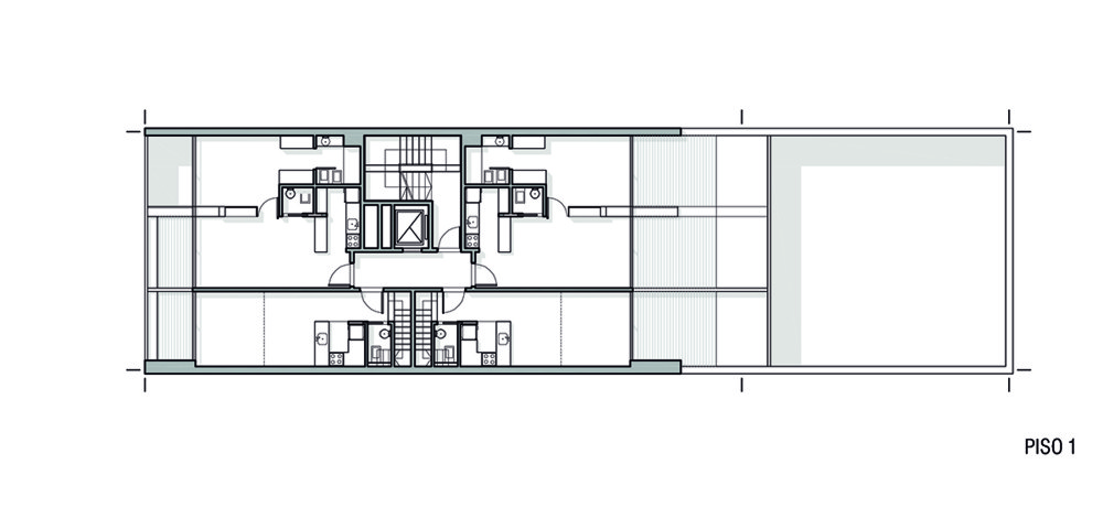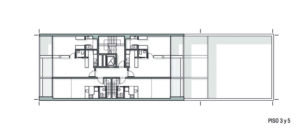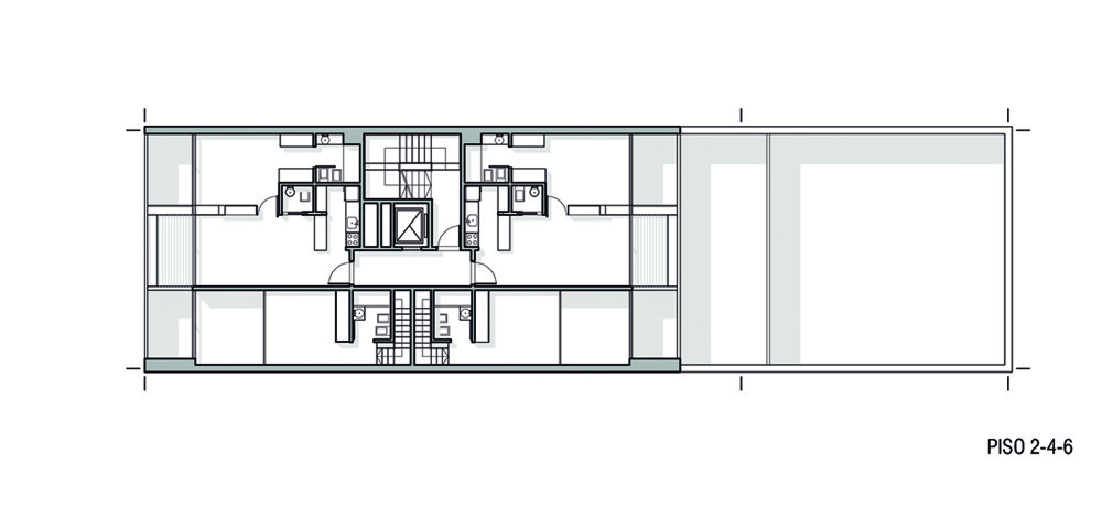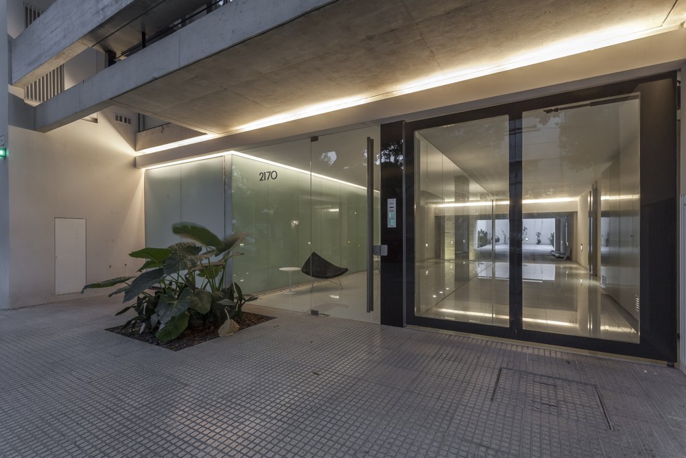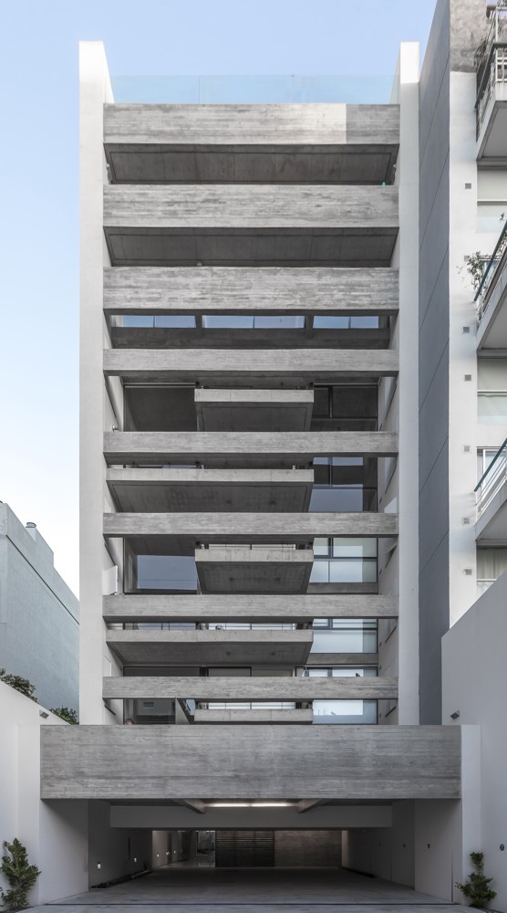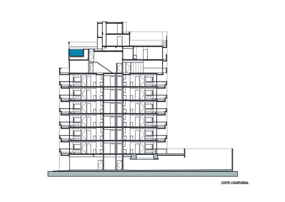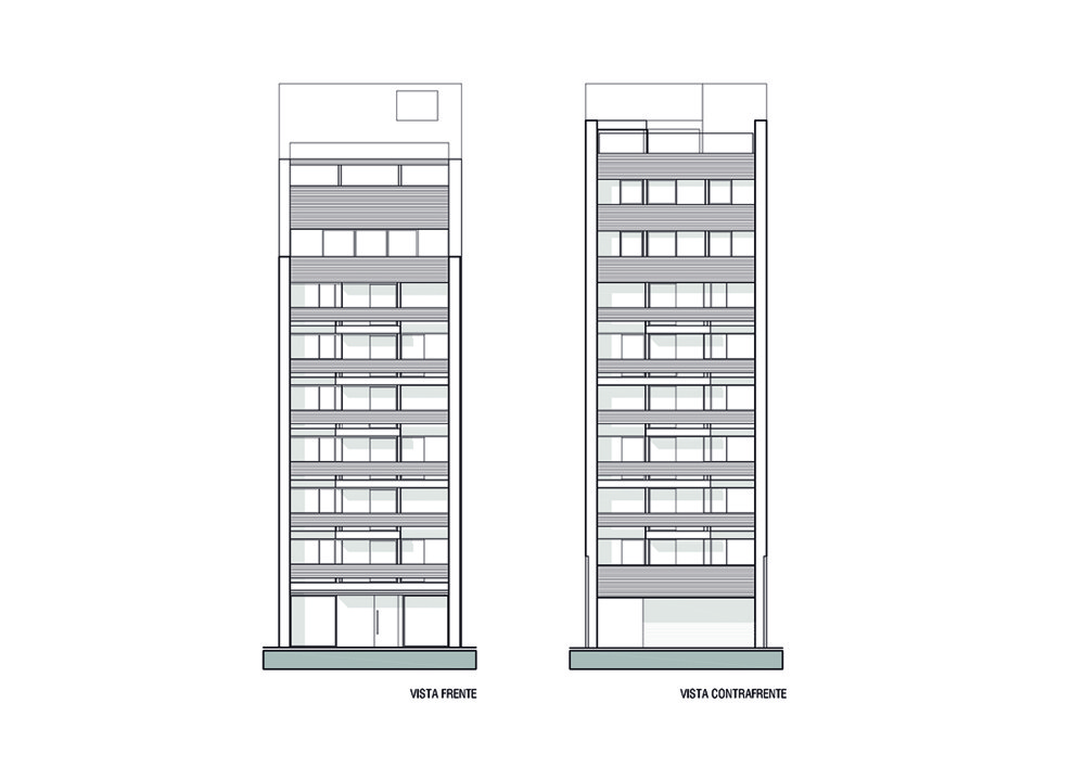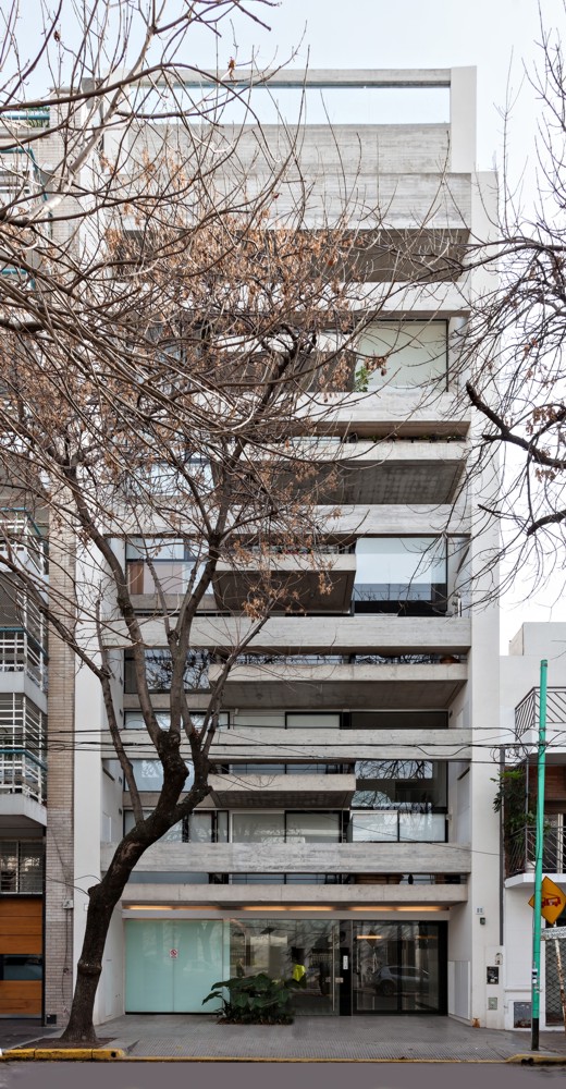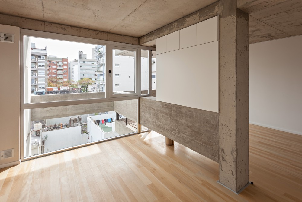 Funcionalmente, el edificio presenta en los primeros seis niveles unidades de dos ambientes de 50 metros cuadrados que se desarrollan haciendo evidente cuáles son los elementos estructurales. Cada viga que se repite y que recorre todo el frente del edificio, se relaciona con una ménsula que estructura parte de un elemento/mueble divisor, determinando así las relaciones de uso de las unidades.