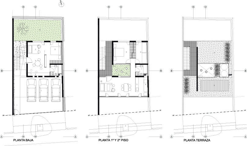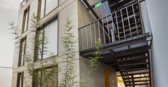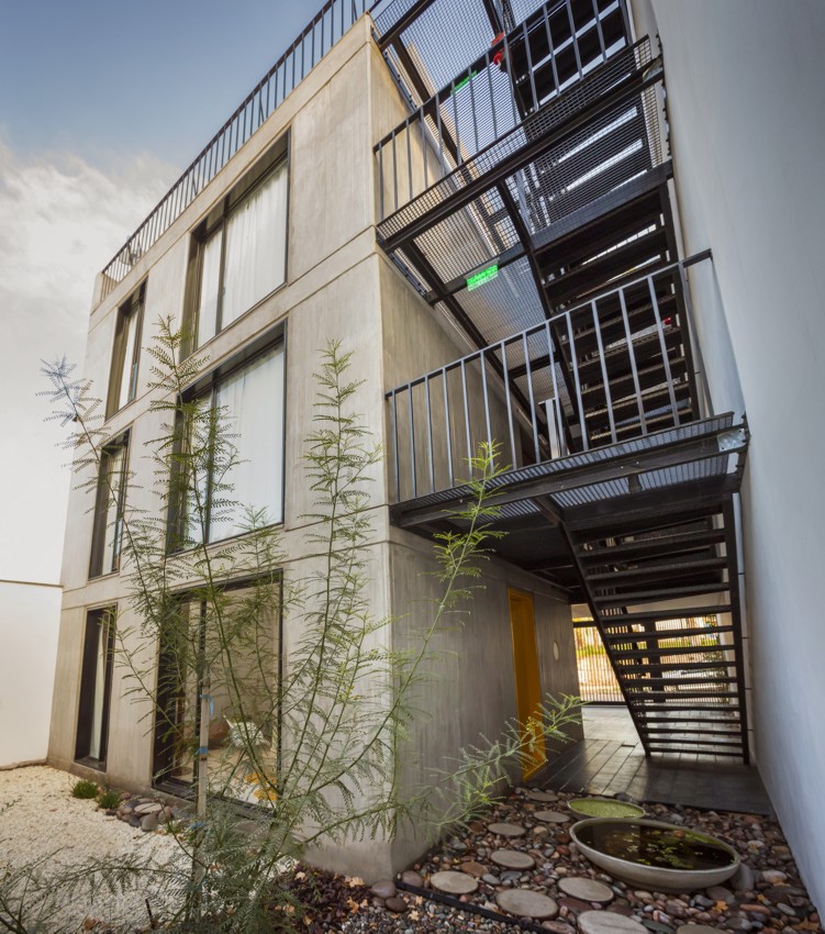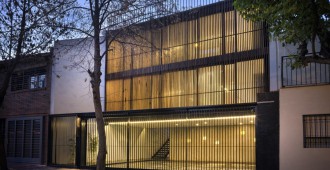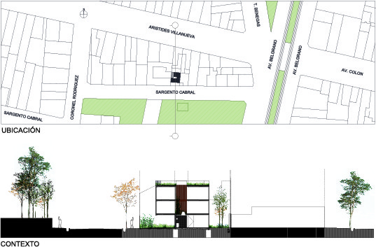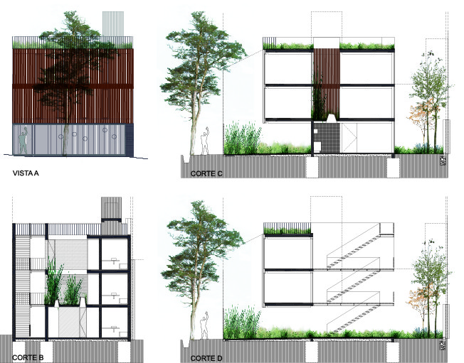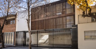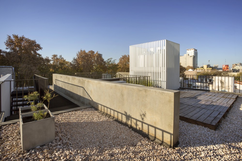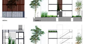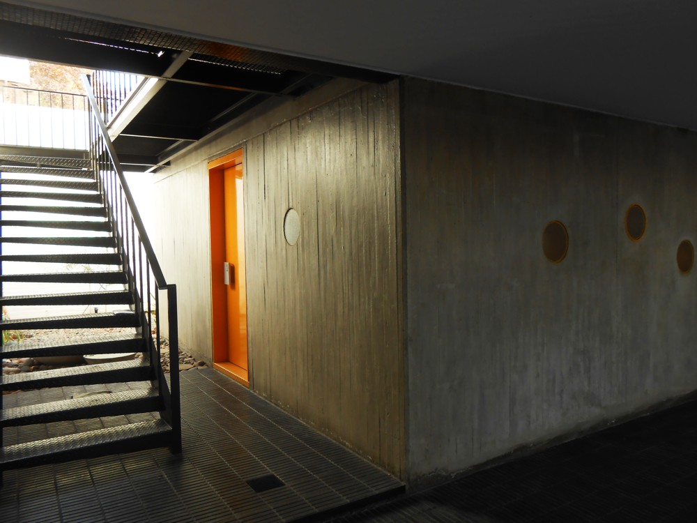 ESCALA83 Apartamentos. Es un pequeño edificio de departamentos de alquiler, ubicado en la Quinta Sección de la ciudad de Mendoza (Argentina), una franja bien definida de la ciudad, próxima al Parque Gral. San Martín, con preponderancia de casas bajas, que de a poco va cambiando su perfil hasta alcanzar los 12m, altura máxima permitida. Particularmente, frente a este terreno se encuentra un Parque y Sede de Bomberos que junto con la Plaza del Archivo Histórico, forman un conjunto de arboles añosos. De acuerdo al FOT (factor ocupación total), se consiguió construir tres departamentos – uno por piso – en planta baja de menor superficie y dos más amplios en los niveles siguientes. El edificio se inserta dentro de la trama retomando las líneas y alturas de sus vecinos colindantes, sintetizado en un solo plano y unificando el retiro obligatorio. Sobre la Línea Municipal, un portón de rejas marca el límite entre privado y público, el ingreso peatonal y vehicular, mientras el suelo de baldosa calcárea ingresa al solar integrando exterior e interior. Un bloque de hormigón es el único apoyo visible en este nivel. Sólo algunas perforaciones en el muro permiten ver hacia la calle; el departamento de Planta Baja se abre francamente al Norte, hacia un patio de granza, muros con enredaderas y plantas de bajo consumo hídrico, que se integra al interior. El núcleo de escaleras está resuelto con una malla de planchuelas industrializada, así este espacio aporta luz y aire en todos los niveles. Los dos departamentos superiores crecen hasta la línea de retiro frontal y ocupan todo el ancho del terreno, donde se organiza el sector de estar-comedor y cocina, delimitado con un frente totalmente vidriado que extiende sus límites visuales hacia la arboleda vecina y se apropia del tilo existente frente a la línea municipal. La fachada, protegida por un cierre de tablas de madera dispuestas verticalmente, abre o cierra las miradas según la posición del observador. Aprovechando la orientación Norte-Sur del lote, se dispuso un patio entre el área de estar y los dormitorios, delimitado por paños y aberturas vidriadas transparentes o traslúcidas, que produce circulación de aire e ingreso de luz en todos los ambientes y crea un nuevo paisaje interior. Al Oeste se cierra con tablas de madera que actúan como filtro solar y dan privacidad a las viviendas. La fachada Norte se asienta sobre el terreno y se eleva verticalmente como un bloque de hormigón calado por las ventanas de los dormitorios, que manifiestan la altura total de cada piso. Sobre el último nivel, la terraza permite el disfrute de las vistas a la montaña. La superficie se trabajó con un deck de maderas recicladas, piedra pómez partida y se dispusieron plantas resistentes a la exposición solar. El único elemento que sobresale del perfil es un prisma de rejas blancas, que cubre los tanques de agua y por la noche se ilumina recreando un efecto de fanal. El hormigón, la Madera y el Acero definen la estructura y la estética del Edificio. Los materiales quedan expuestos tal cual son, elegidos por su carácter único y sus cualidades físicas. Sin columnas, con grandes vanos y con el tamiz y protección que produce la madera, el exterior y el interior se integran sin interrupciones.