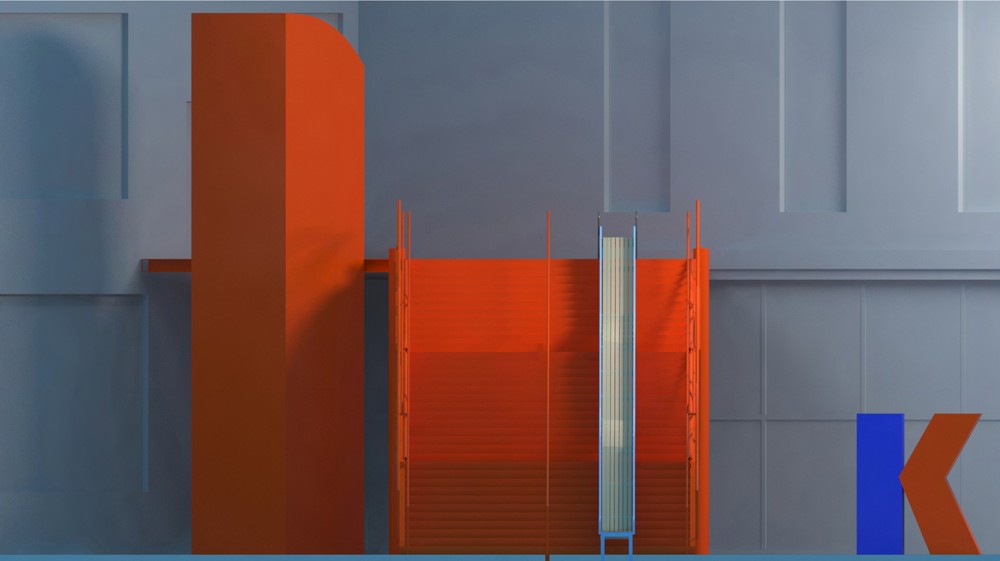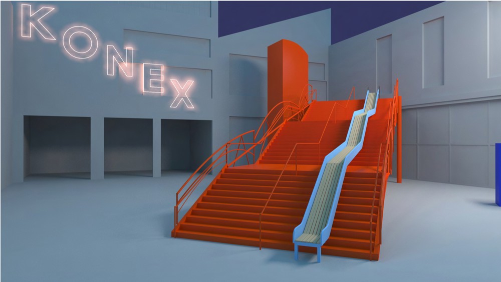 Como una alfombra mágica, un tobogán se posa sobre la escalera de Clorindo Testa: ícono, punto de encuentro y estructura programática por excelencia de la vida en la Ciudad Cultural Konex.