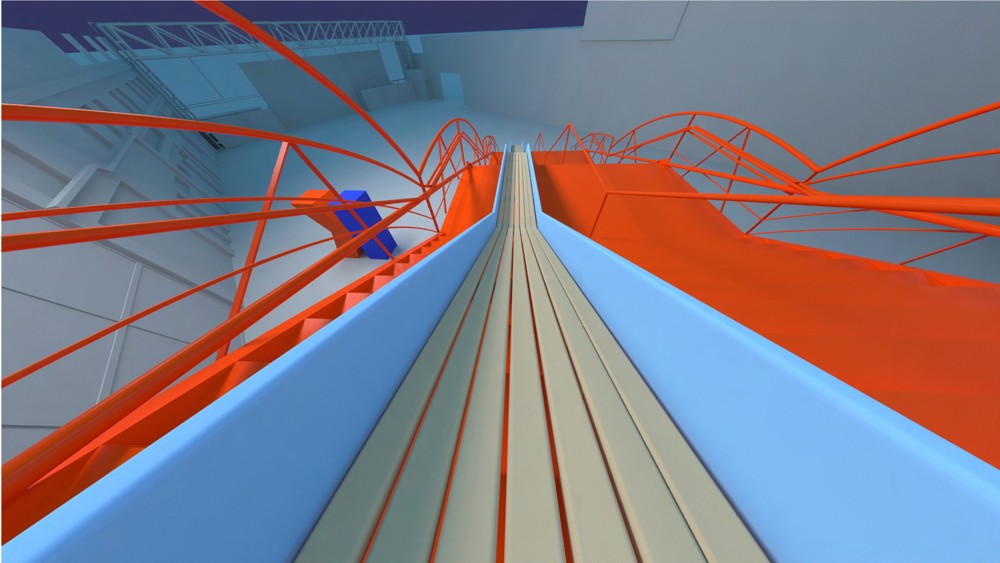 Las vigas/pasamanos de ‘Circuito’ son de un celeste chillón, casi flúo, contrastando con el naranja de la escalera. Las tablas de madera vista completan la paleta de colores.