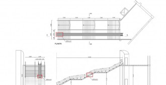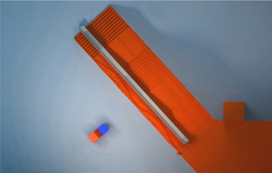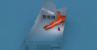 El tobogán copia la topografía de la silueta escultórica de la escalera a lo largo de sus 3 segmentos de escalones y sus dos superficies de descanso y se incorpora al fluido sistema circulatorio del patio: se sube por la escalera o el ascensor… se baja por el tobogán.