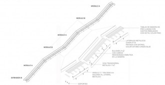 El clásico tobogán de plaza porteño de hierro y superficie de 6 listones de madera abulonados es sometido a dos operaciones de moldeado: es extruido a 18 metros de largo y ondulado para establecer una promenade rítmica de oleaje sobre escalones y descansos.