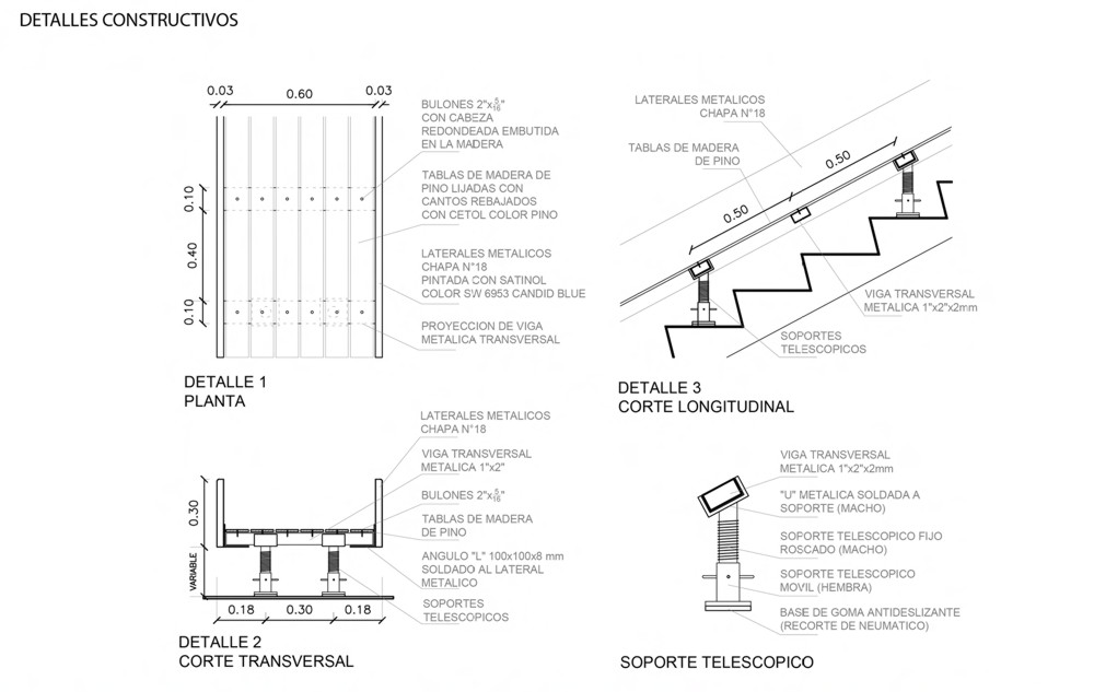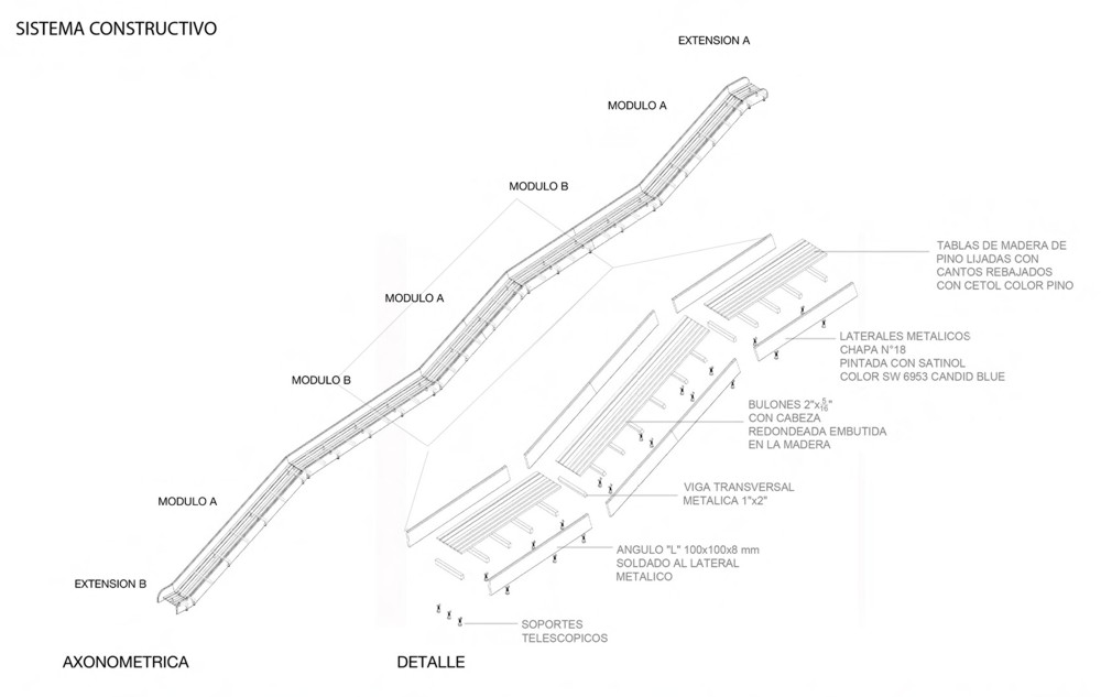 El tobogán es construido en forma modular para facilitar su montaje y desmontaje tanto al principio y al final de su interacción con el espacio Konex como para permitir su armado y desarmado cuando la programación del Centro Cultural así lo requiera.