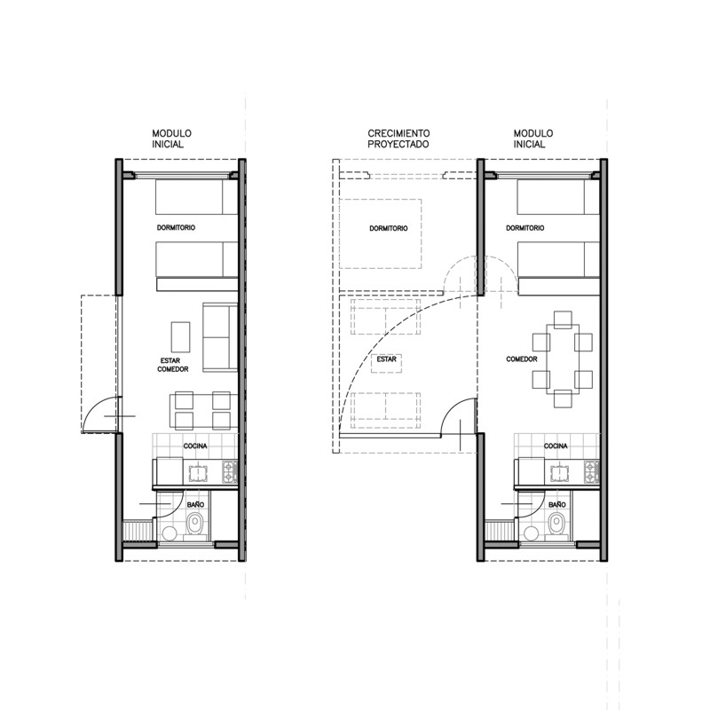 Planteamos para esto un módulo base, que contempla las transformaciones y crecimientos a futuro de la casa, poniendo en el centro la participación del usuario en estas definiciones proyectuales.