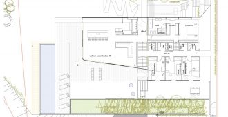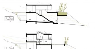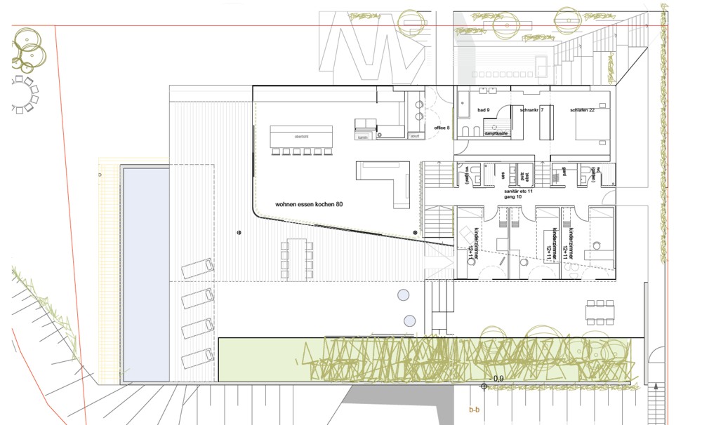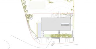 Located on the periphery of the city, the plot of land offers a spectacular view of Linz, as long as one builds high enough to be able to gaze over the neighbouring properties. That is why the ground storey lies about 6m above street level – withthe pleasant side-effect of allowing the garden area to adjoin the living areaon the same level to the west and north, despite the extremeslope.