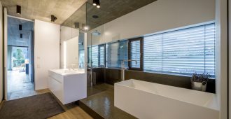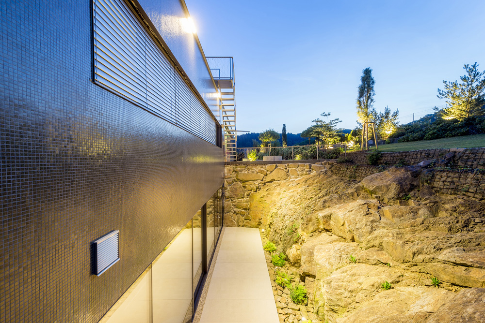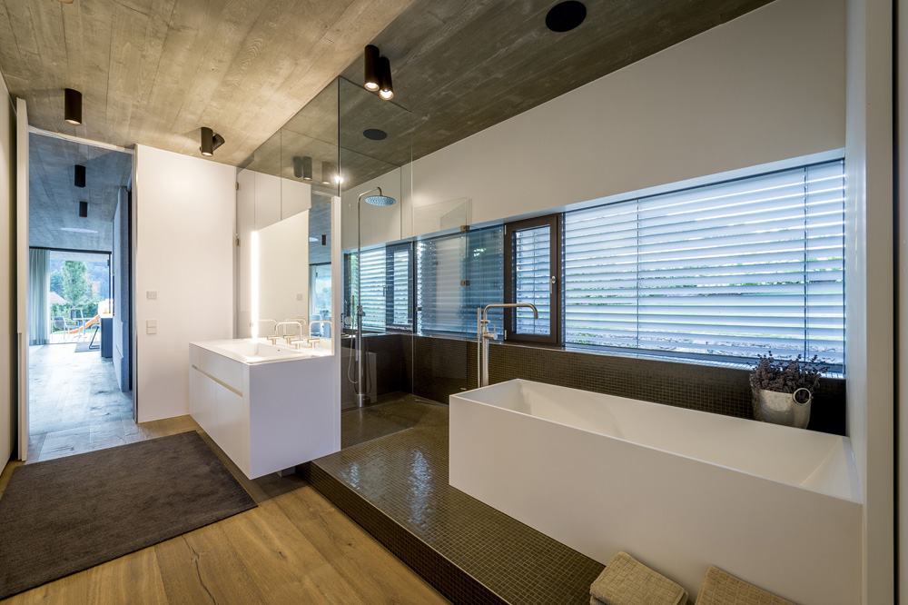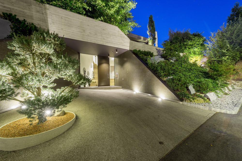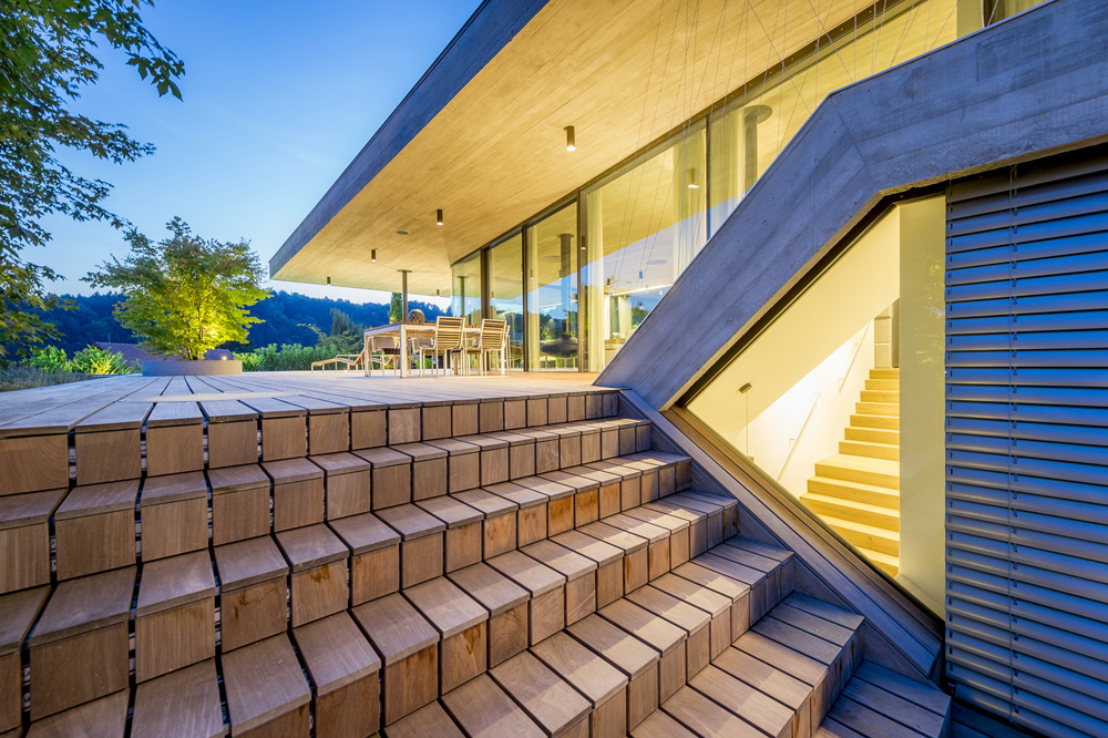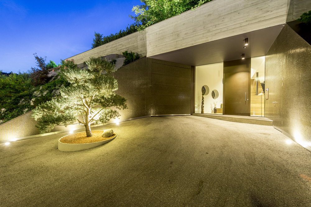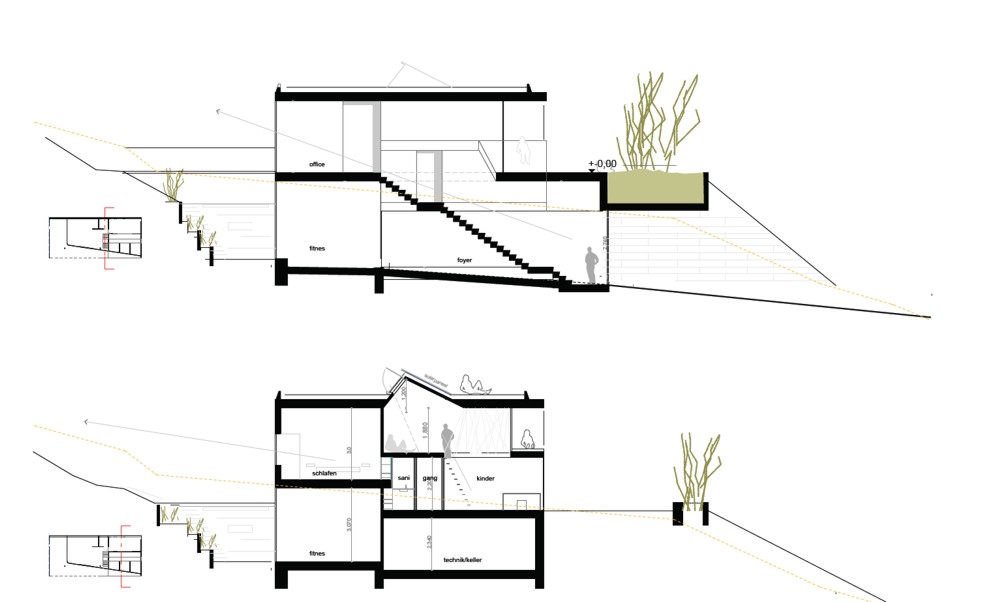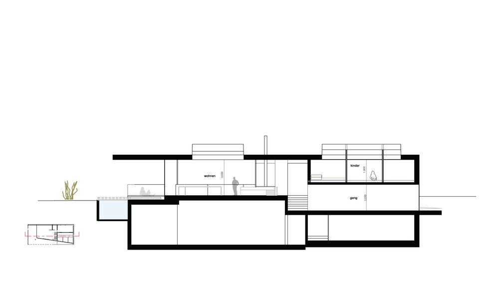 The main entrance (which at the same time serves as a drive leading to the spacious garage area) cuts spectacularly into the embankment, while a single-run stairway leads from the entrance to both the living storey and the cloakroom and wellness area, which is set off somewhat from the entrance. The sauna opens uponto a discreetrock garden on the northern part of the property.