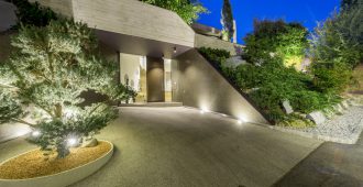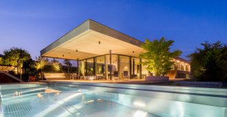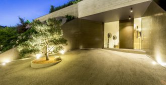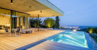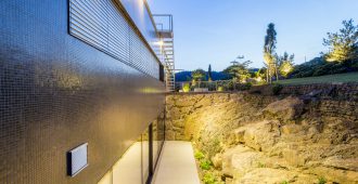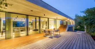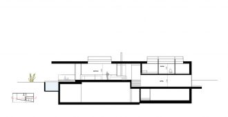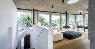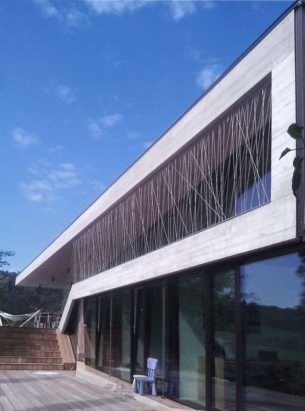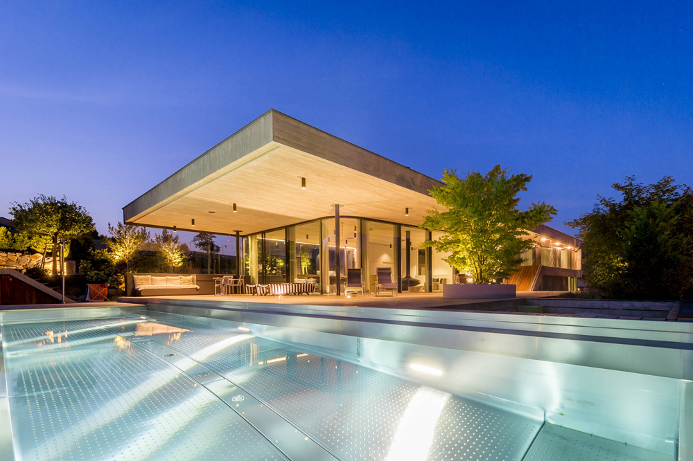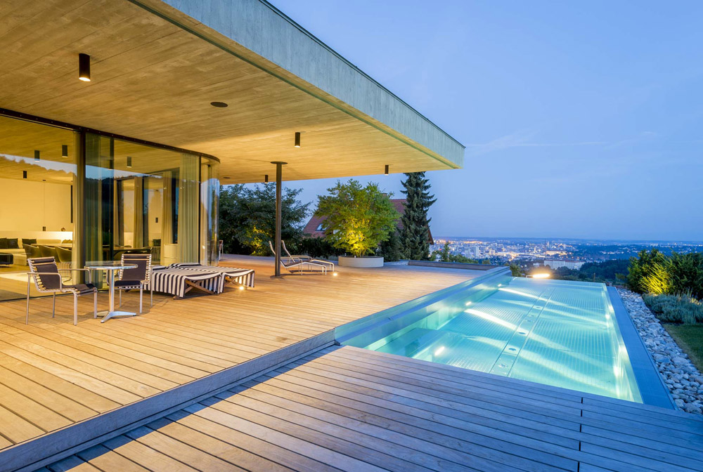 The dark golden brown of the mosaic tiles on both the interior and the facade match the fair-faced concrete surfaces produced from roughly-cut shuttering; the projecting cantilevered roofcovers wide-ranging terrace areas, with wooden flooring that continues fromthe spacious halls in the living areas. The inner and outer living areas are only separated by delicatefull glazing, large parts of which can be opened.