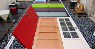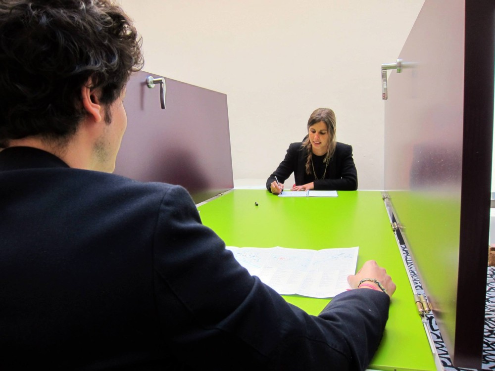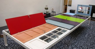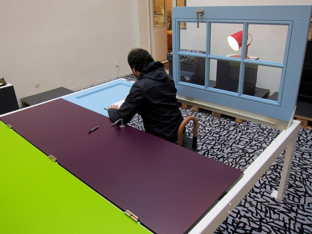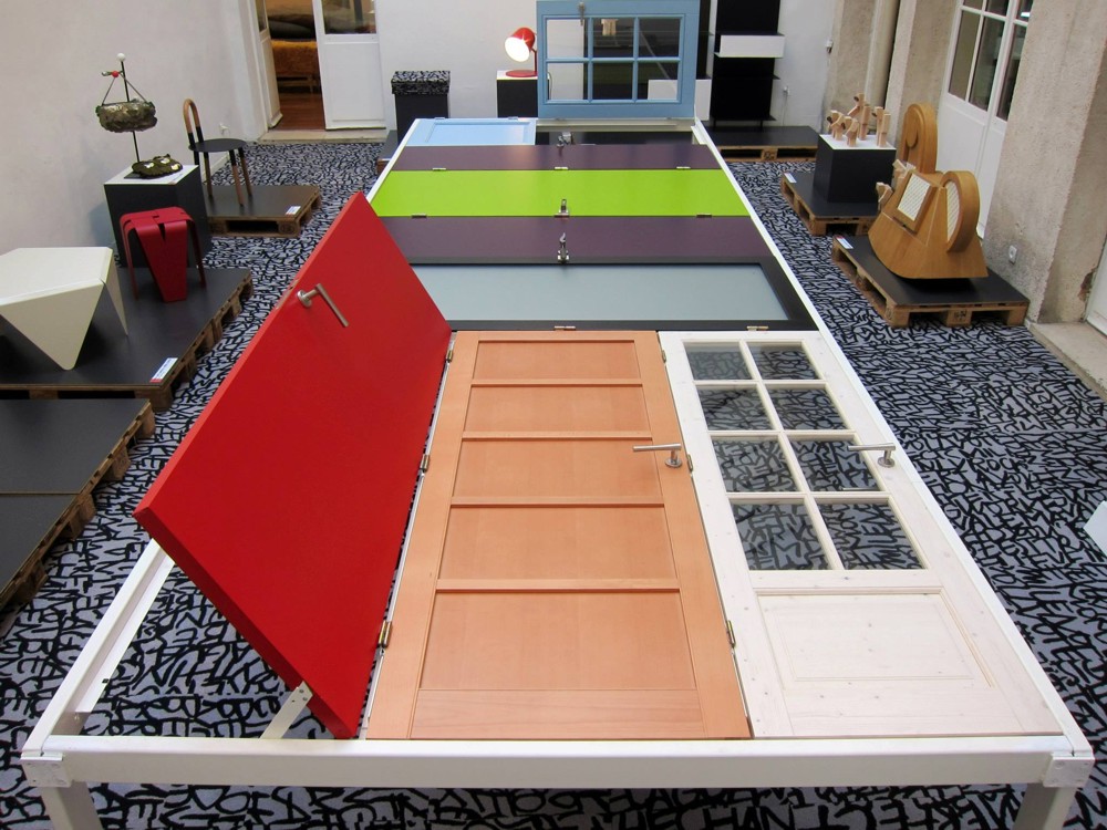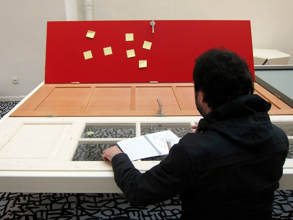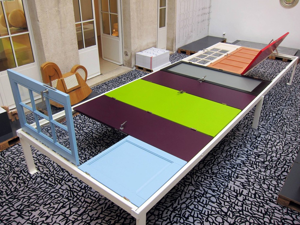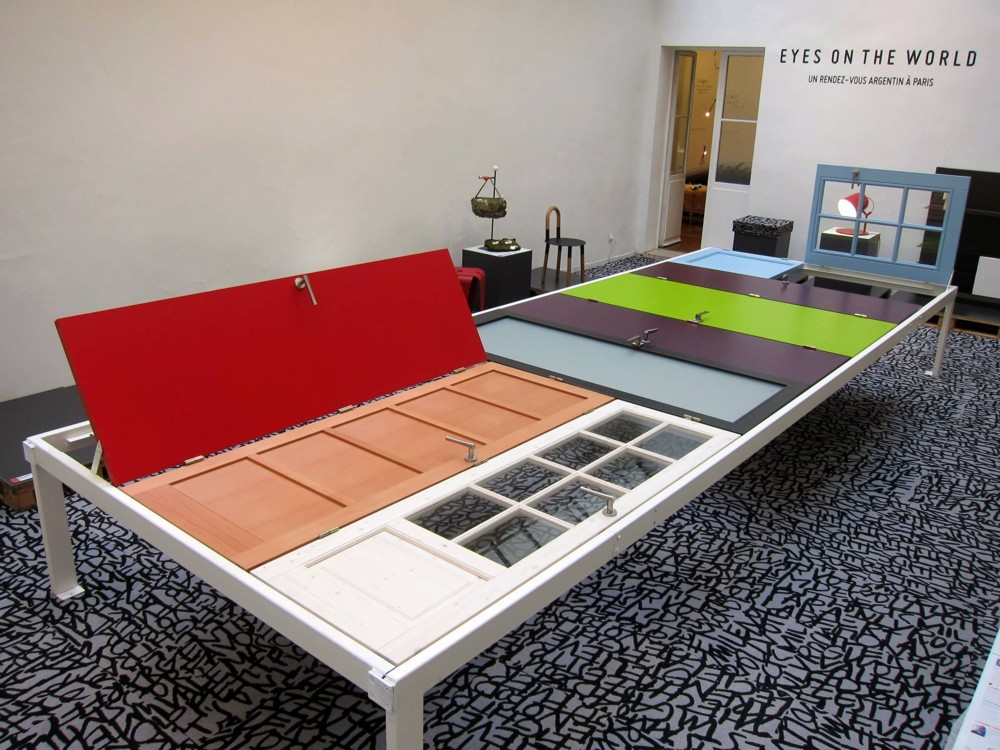 Puertas separan de forma cotidiana la esfera pública de nuestro propio espacio privado. La acción pivotante de estas ‘válvulas’ arquitectónicas abren y cierran historias de vida. Estos dispositivos sintetizan el umbral entre la vida urbana y nuestra vida doméstica. Hogar, dulce hogar. No molestar. Puertas de placard resguardan nuestra intimidad, nuestro orden obsesivo-compulsivo o nuestro caótico lío, dentro y fuera del closet. ‘Banquet(te)’ es una obra de arquitectura que se manifiesta en forma de mobiliario performático. ‘Banquet(te)’ es una mesa con voladizos de 2x6mts cuya superficie está constituida íntegramente por puertas de catálogo de Lapeyre (Francia). Puertas de exteriores, de interiores y de placard se abren y cierran individualmente para generar diversas relaciones humanas a través de una variedad de configuraciones espaciales, organizacionales y sociales: desde una gigantesca mesa de comedor comunitario o de reunión es hasta estaciones de trabajo individuales en forma de cubículos. El sistema permite generar grados de mayor y menor privacidad e interacción según las necesidades. ‘Banquet(te)’ es una mesa habitable. La apertura de una puerta para crear una partición tiene una consecuencia espacial no programada de generar en simultáneo un vacío dentro de la mesa a ser ocupado por usuarios. ‘Banquet(te)’ puede proporcionar superficie de mesa para hasta 40 personas, tanto a lo largo de su perímetro así como dentro de su propio marco.