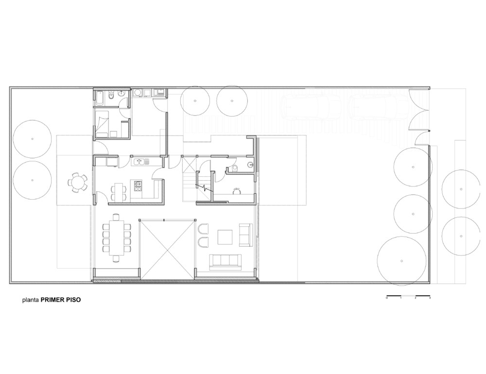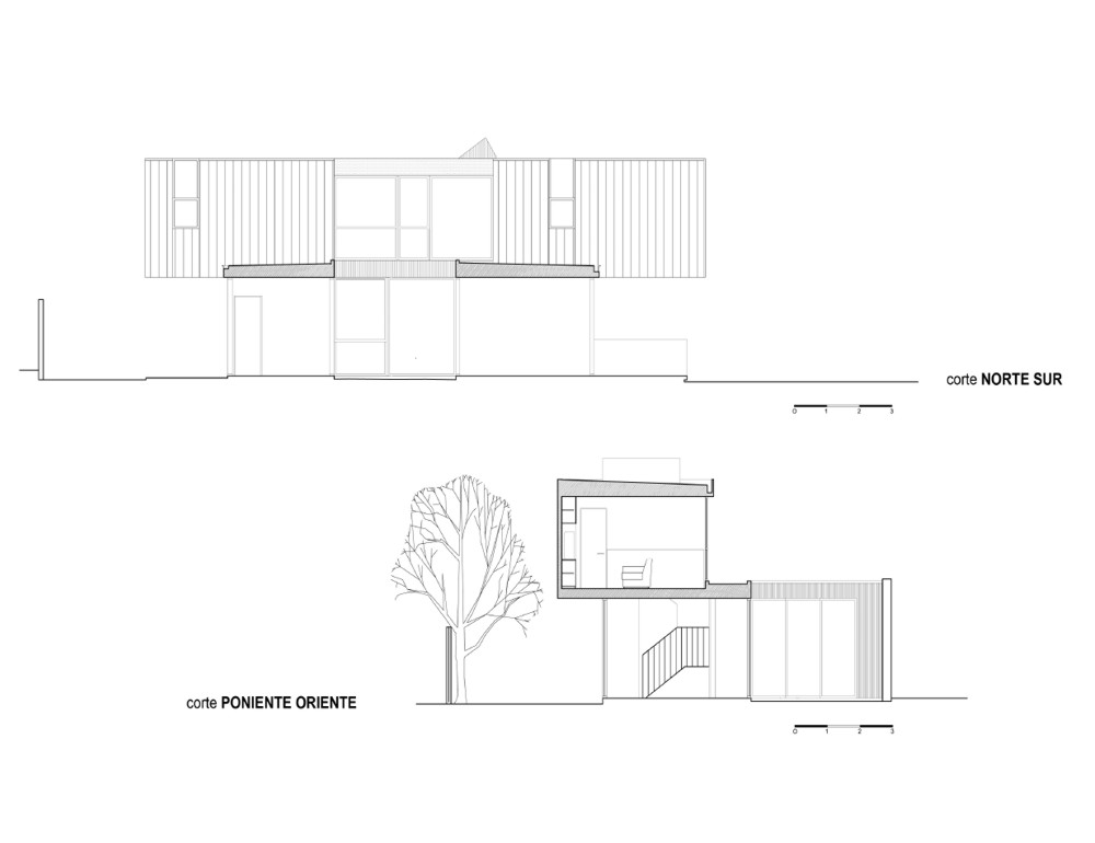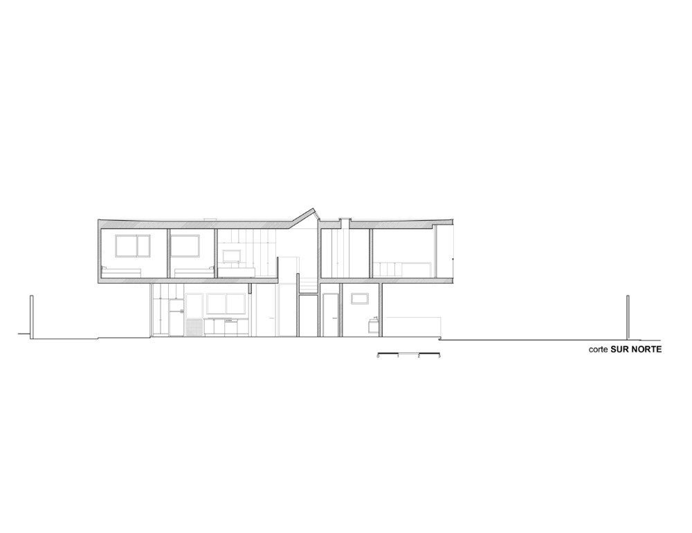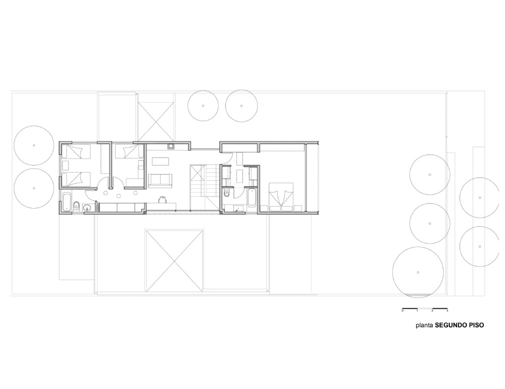 Buscando mantener la mayor cantidad de terreno despejado se opto por subir los dormitorios y estar familiar al segundo nivel aprovechando las vistas lejanas utilizando las cubiertas de primer piso.