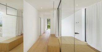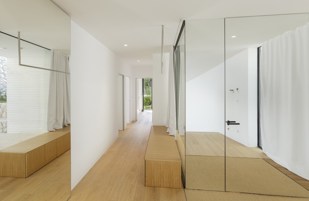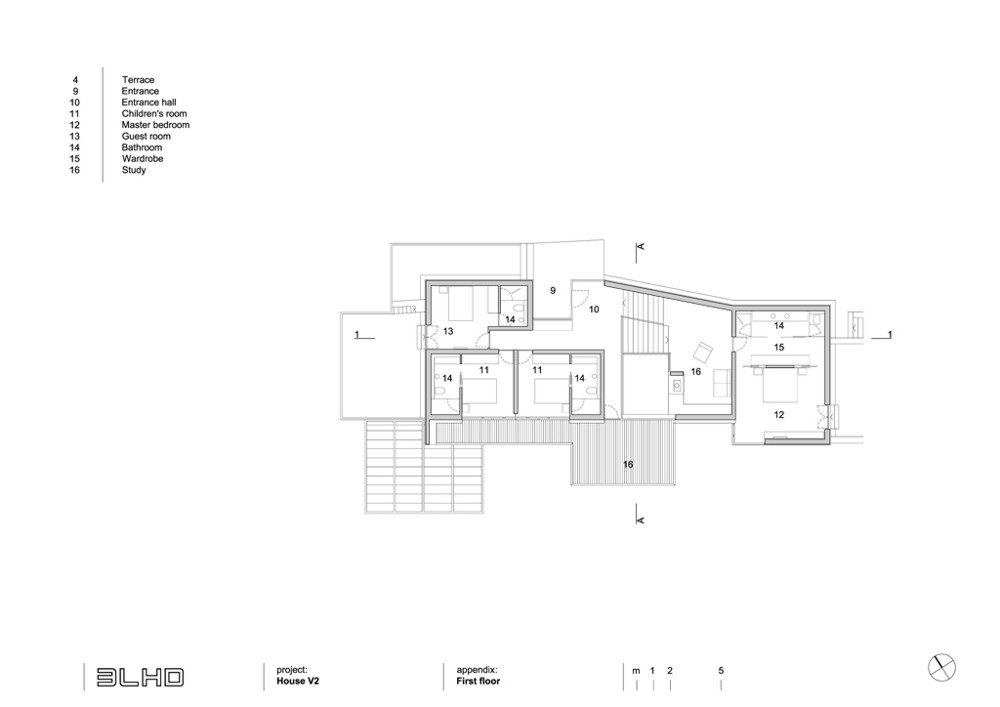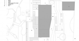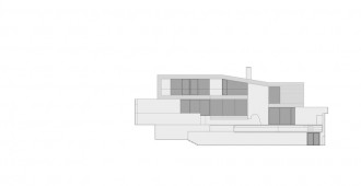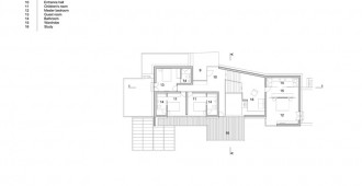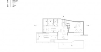 La casa se desarrolla en varios niveles, debido a la pendiente de la parcela – la entrada está en la planta superior, la zona de estacionamiento está al lado de la calle, y las otras actividades se organizan en desniveles: tres dormitorios con sus cuartos de baño , el dormitorio de los padres con un vestidor y un cuarto de baño, escalera, amplia sala de estar, comedor, cocina, espacio de servicio, almacenamiento y aseo, sala de TV con una pantalla de proyección y espacio para que los niños jueguen. El living y comedor tienen una conexión directa con los espacios exteriores – terraza parcialmente cubierta con una piscina al aire libre. El medio ambiente también se ha diseñado en varios niveles – terrazas que están conectados por escaleras y descienden hasta el mar.