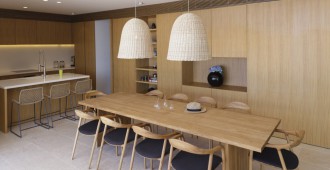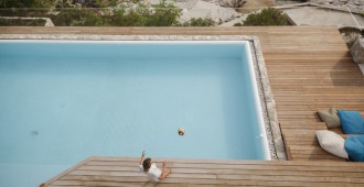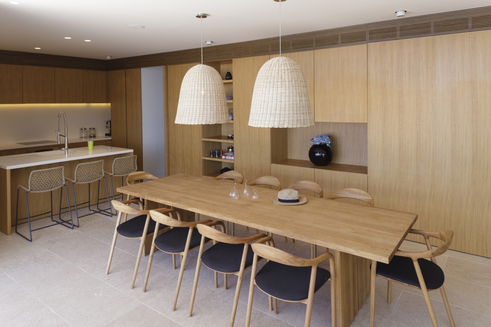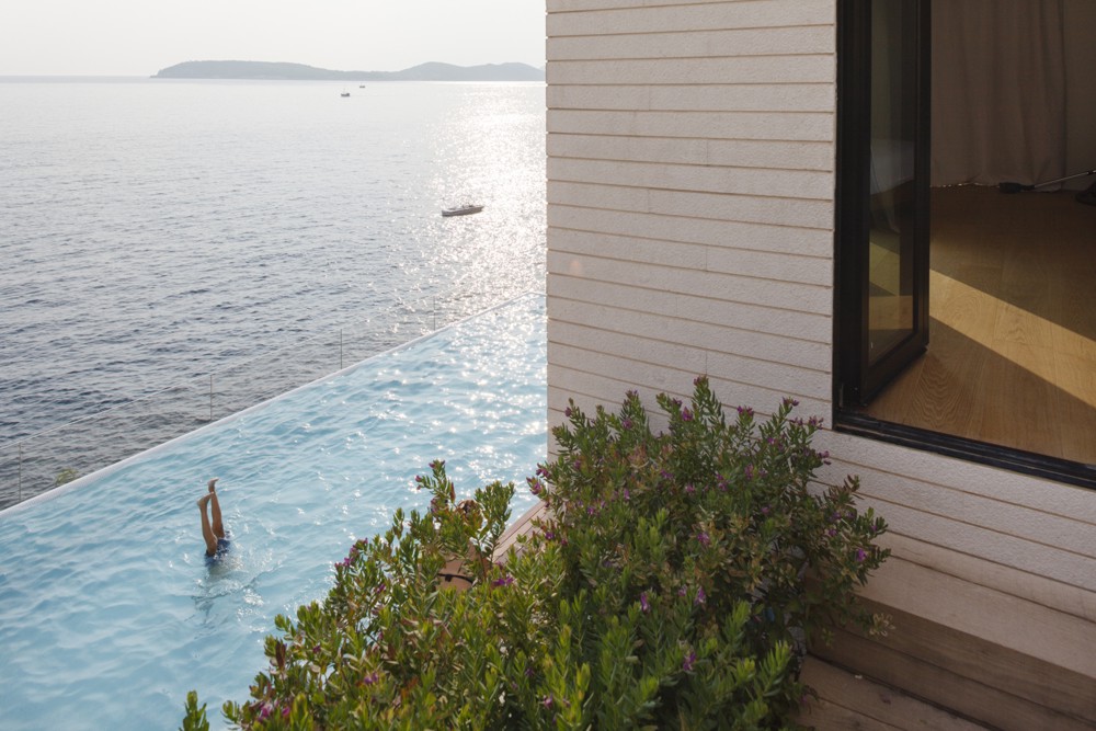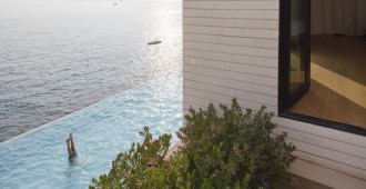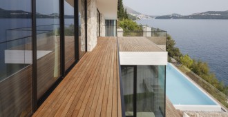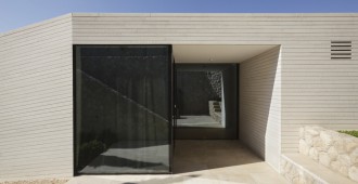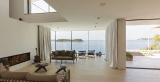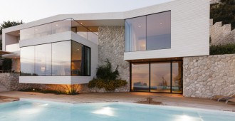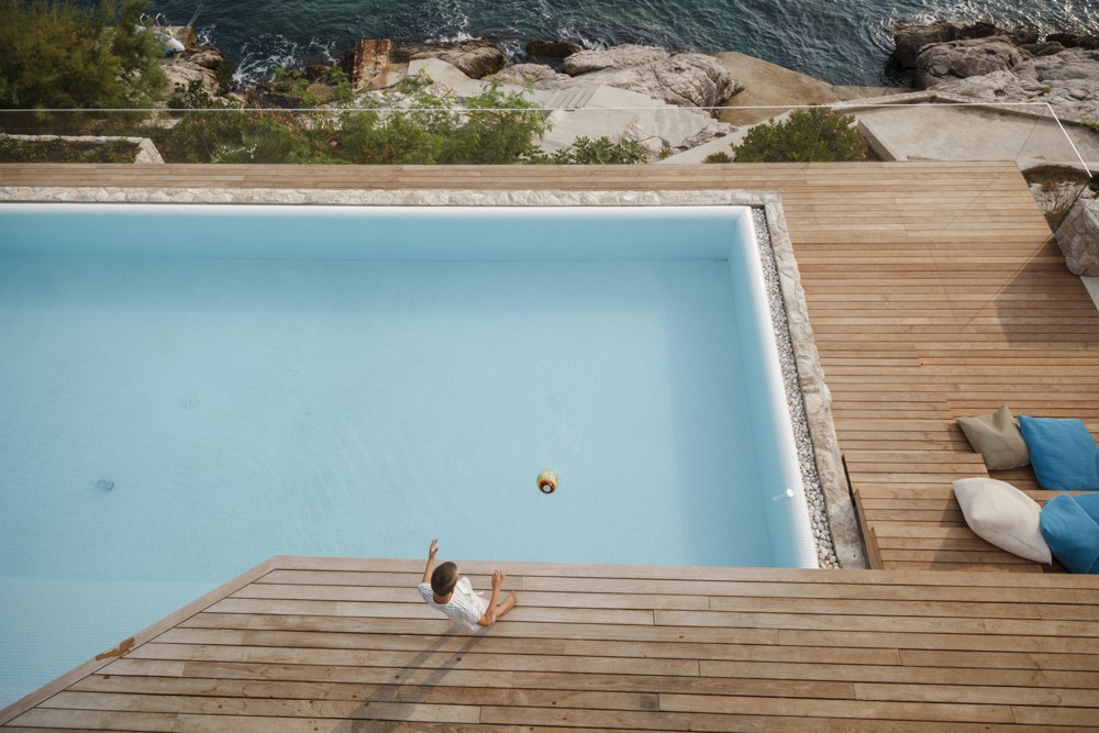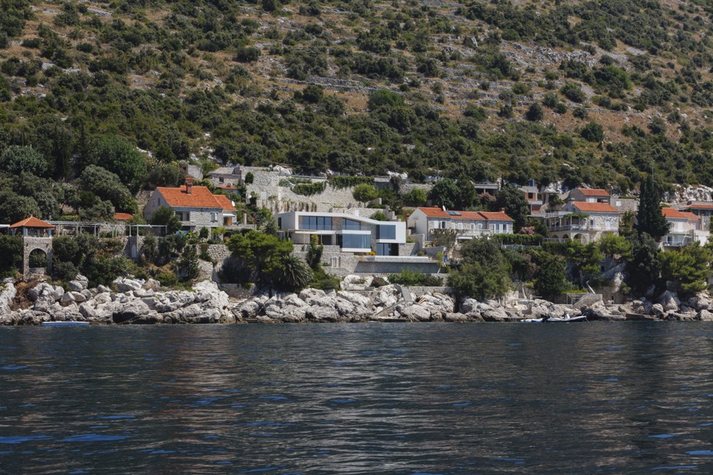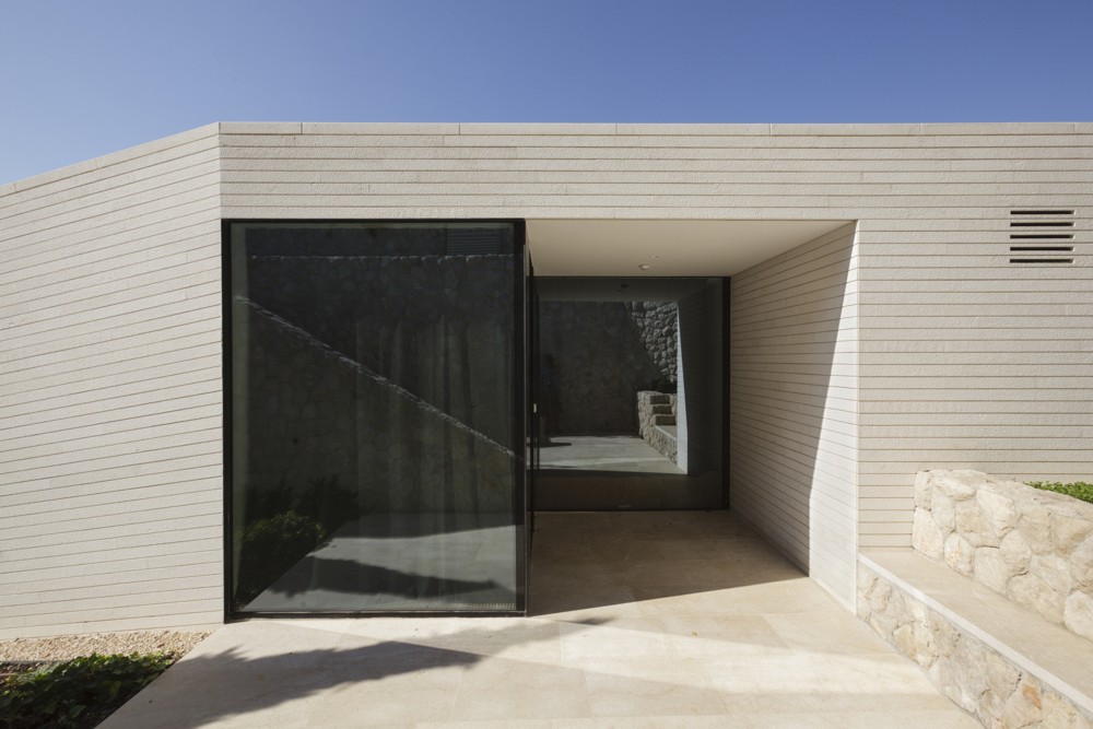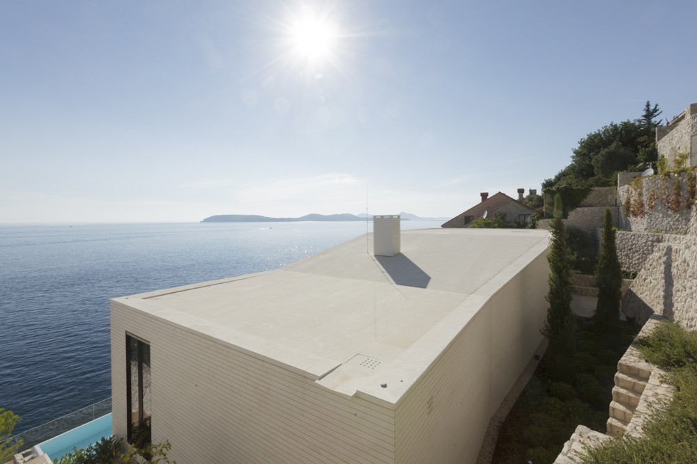 La fachada y el techo están revestidos con placas de piedra blanca; grandes ventanas de cristal están parcialmente empotradas en el volumen y abren la casa hacia el mar, pero al mismo tiempo, garantizan una agradable sombra en el interior. Las terrazas están pavimentadas con piedras o tablones de madera de teca y todas las superficies disponibles están plantados con especies vegetales autóctonas y ejecutadas en materiales adaptados a la zona y a su clima.