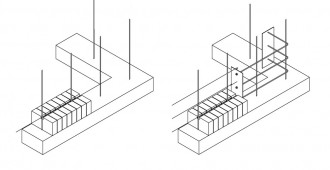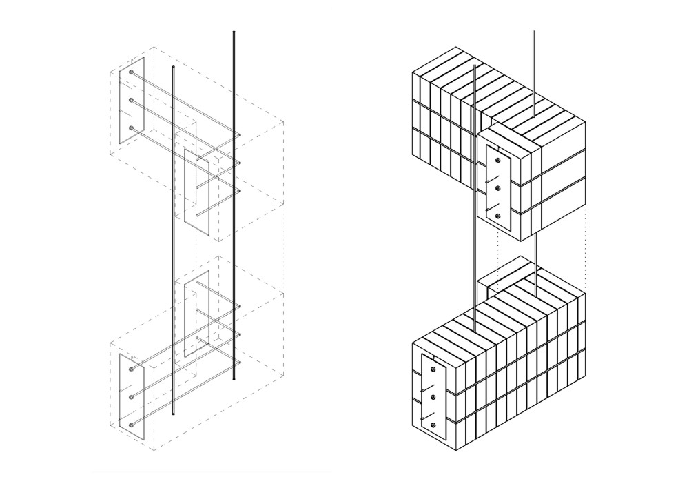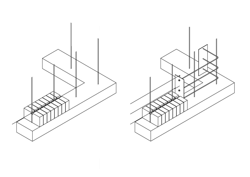 El problema del aparejo a sardinel es su falta de traba. Para solucionar esto se idea un sistema de refuerzo en las esquinas y extremos de los muros que consiste en agrupar los adobes en {sillares} confinándolos entre pletinas metálicas, haciéndolos trabajar monolíticamente.
