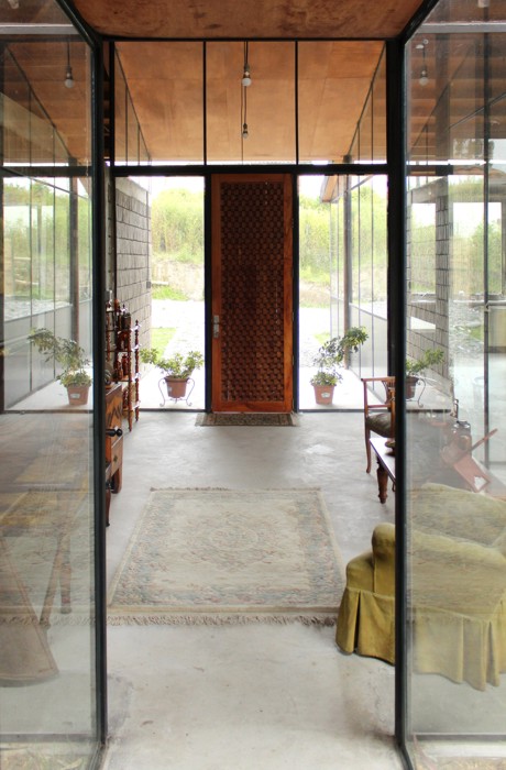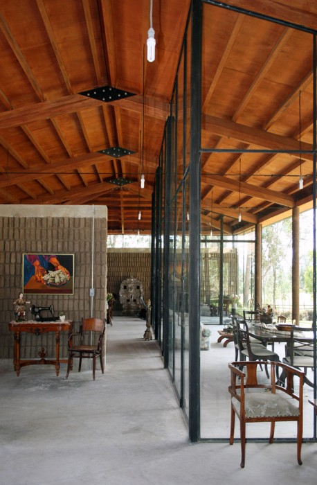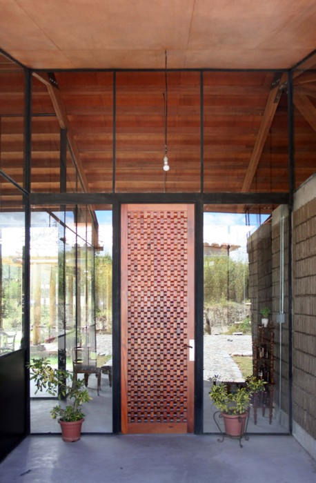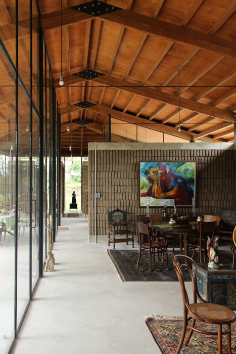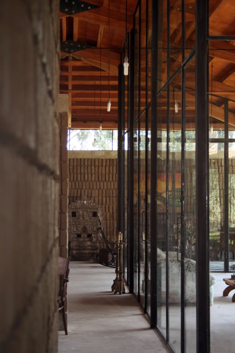 La mampostería de tierra supone la creación de cajas. Estos muros plegados encierran el programa arquitectónico. Así, el volumen preexistente se rehabilita al interior para albergar el dormitorio y las zonas más intimas de la vivienda. Luego, el nuevo volumen alberga las aéreas sociales: cocinar, comer, estar. De esta manera, los pliegues de barro se convierten en expositores constantes de la galería y los pliegues de vidrio son los expositores del entorno hacia el exterior y de los muros hacia el interior.