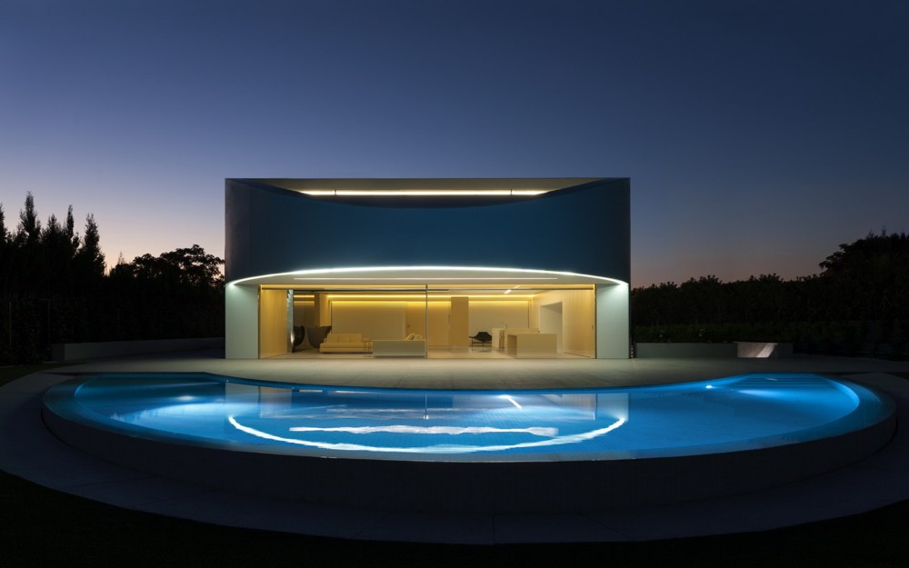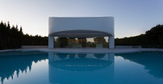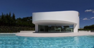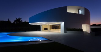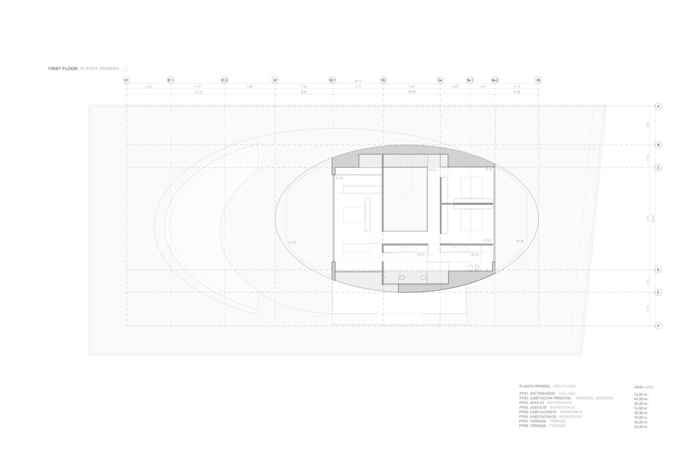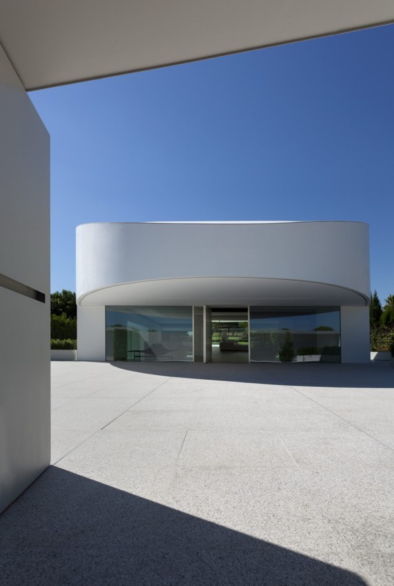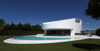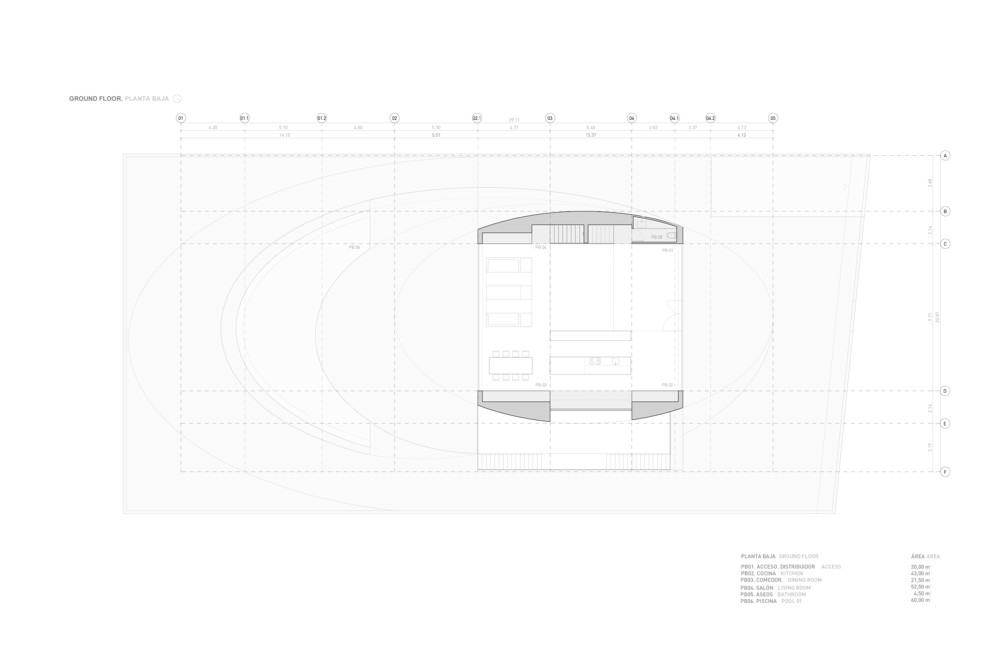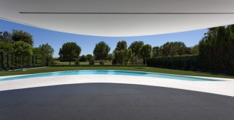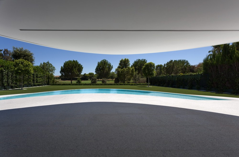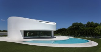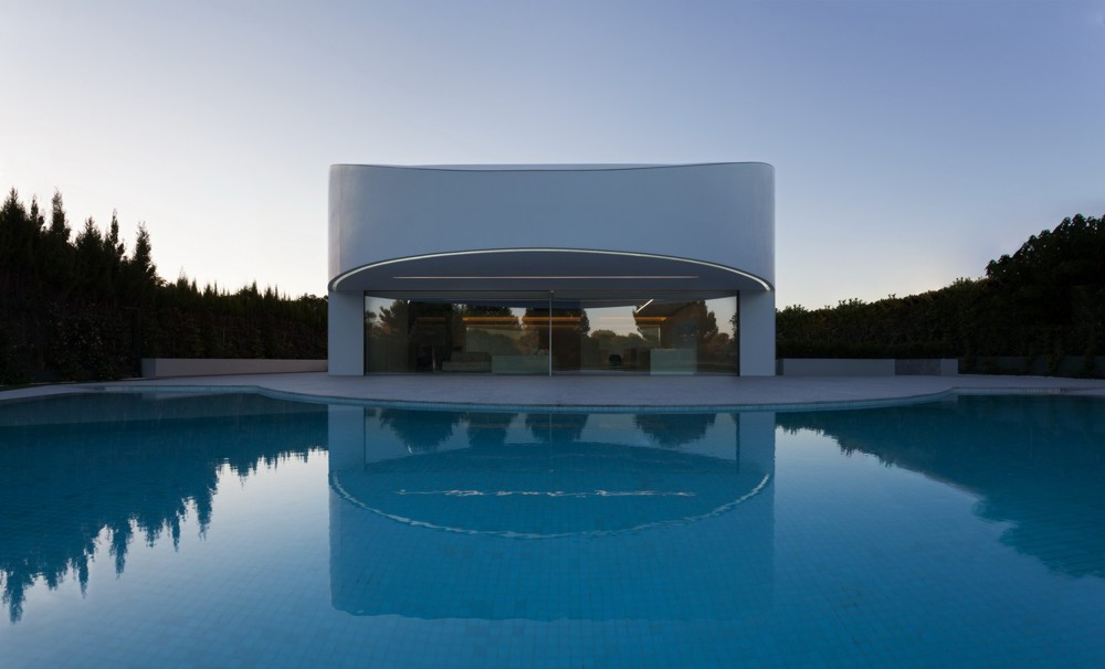 Un lugar privilegiado inmerso en un campo del Golf situado en las proximidades de Valencia, supone el punto de partida del proyecto. La propuesta se dibuja a través de trazas elípticas que contienen el programa, maximizando las posibilidades dadas por la normativa y minimizando el impacto volumétrico sobre el lugar. Se dispone así una pieza con una fachada continua, que parece albergar una única planta y cuya condición visualmente aerodinámica hace que la mirada fugue hacia la profundidad del paisaje vecino. La pieza se deposita liberando la mayor superficie posible en el frente sur de la parcela para aprovecharla como jardín. Los limites laterales intentan desdibujarse mediante la vegetación. El resto de elementos que configuran la urbanización recuerdan la naturaleza curva de la topografía del lugar. El espacio interior de la vivienda se articula mediante un vacío central en el que se encuentra el núcleo de comunicación. Los espacios de servicio, las instalaciones y la cocina, permiten ortogonalizar el trazado curvo de una planta baja abierta al jardín. La planta superior con las habitaciones y la planta sótano abierta al patio dotan a la vivienda de espacios acotados. La estructura de hormigón de la planta baja sostiene mediante cuatro soportes el arco de cubierta del que cuelga el forjado de la zona de noche. Esta estructura se recubre mediante una fachada ventilada monolítica realizada con un Solid Surface que con simple curvatura y sin necesidad de termoconformarse se adapta a la geometría de la pieza. El resto de materiales van del blanco al negro pasando por todos los grises. Otras explicaciones se superponen a esta descripción como, por ejemplo, una alfombra de luz que transforma, con el paso de las horas, el interior de la casa.
