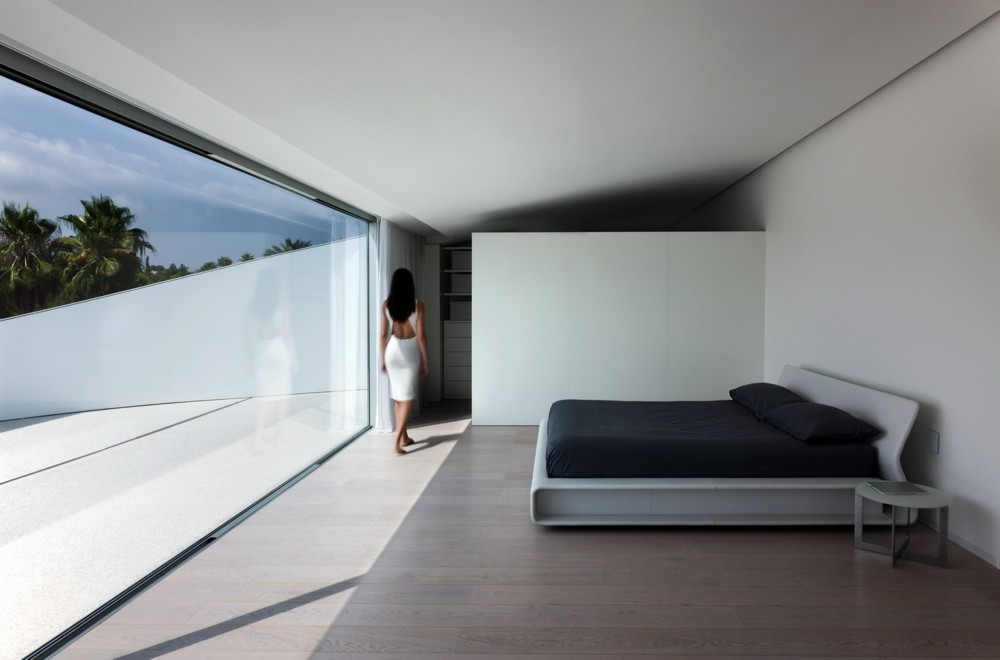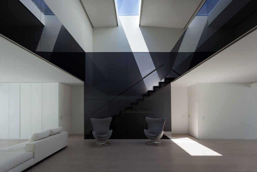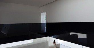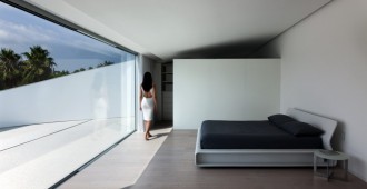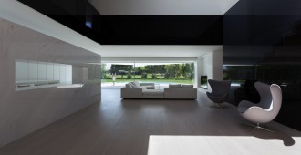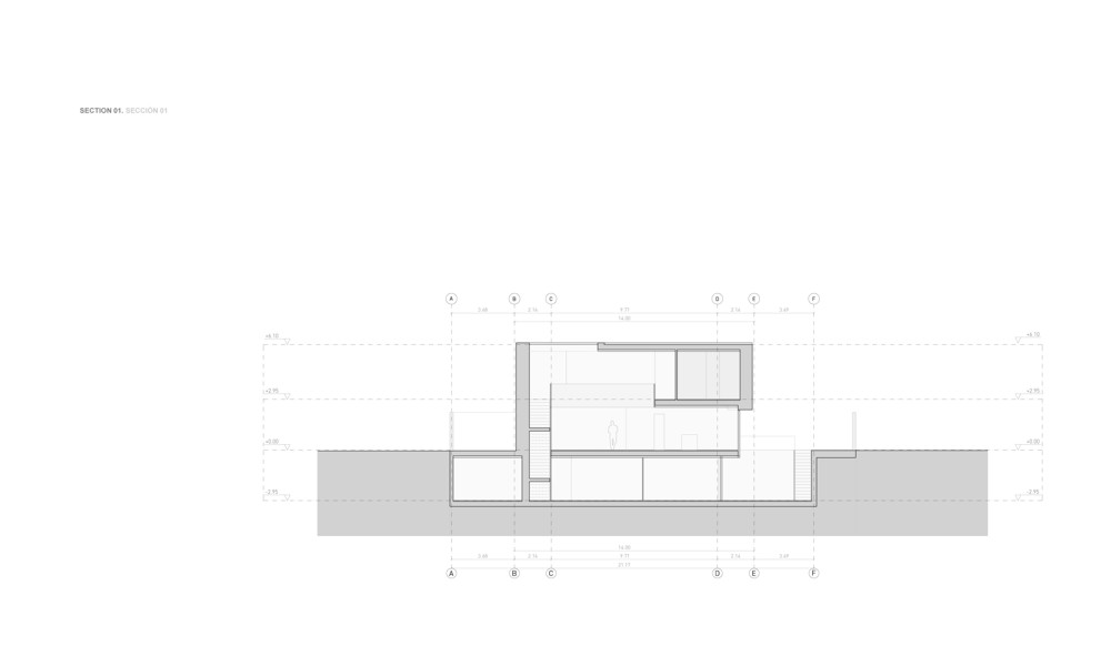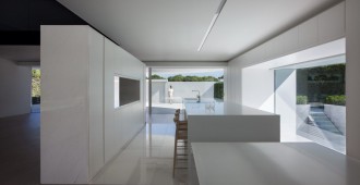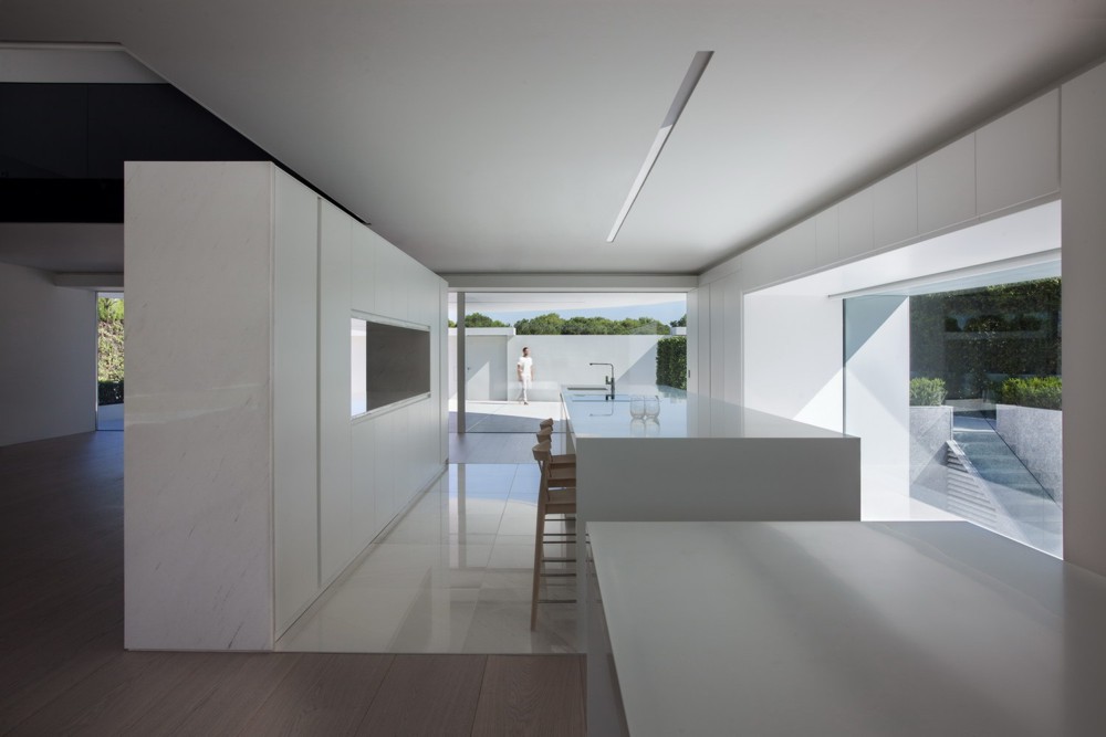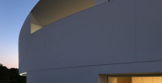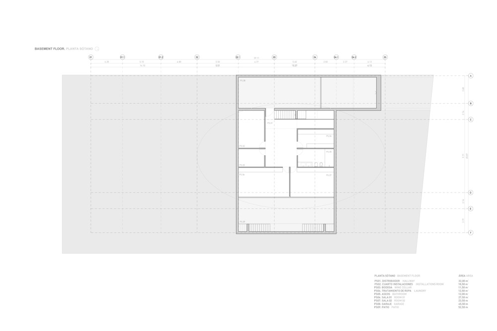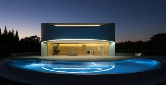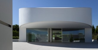 Un lugar privilegiado inmerso en un campo del Golf situado en las proximidades de Valencia, supone el punto de partida del proyecto. La propuesta se dibuja a través de trazas elípticas que contienen el programa, maximizando las posibilidades dadas por la normativa y minimizando el impacto volumétrico sobre el lugar. Se dispone así una pieza con una fachada continua, que parece albergar una única planta y cuya condición visualmente aerodinámica hace que la mirada fugue hacia la profundidad del paisaje vecino. La pieza se deposita liberando la mayor superficie posible en el frente sur de la parcela para aprovecharla como jardín. Los limites laterales intentan desdibujarse mediante la vegetación. El resto de elementos que configuran la urbanización recuerdan la naturaleza curva de la topografía del lugar. El espacio interior de la vivienda se articula mediante un vacío central en el que se encuentra el núcleo de comunicación. Los espacios de servicio, las instalaciones y la cocina, permiten ortogonalizar el trazado curvo de una planta baja abierta al jardín. La planta superior con las habitaciones y la planta sótano abierta al patio dotan a la vivienda de espacios acotados. La estructura de hormigón de la planta baja sostiene mediante cuatro soportes el arco de cubierta del que cuelga el forjado de la zona de noche. Esta estructura se recubre mediante una fachada ventilada monolítica realizada con un Solid Surface que con simple curvatura y sin necesidad de termoconformarse se adapta a la geometría de la pieza. El resto de materiales van del blanco al negro pasando por todos los grises. Otras explicaciones se superponen a esta descripción como, por ejemplo, una alfombra de luz que transforma, con el paso de las horas, el interior de la casa.