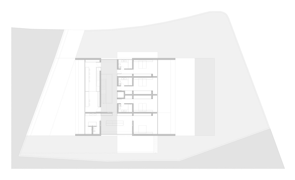 Se dibuja una planta sensiblemente cuadrada, que aglutina un amplio programa de forma compacta. La escalera y el atrio interior centrado distribuyen las estancias, jerarquizando usos, con todos los espacios abriéndose al jardín.