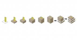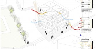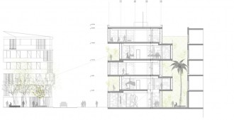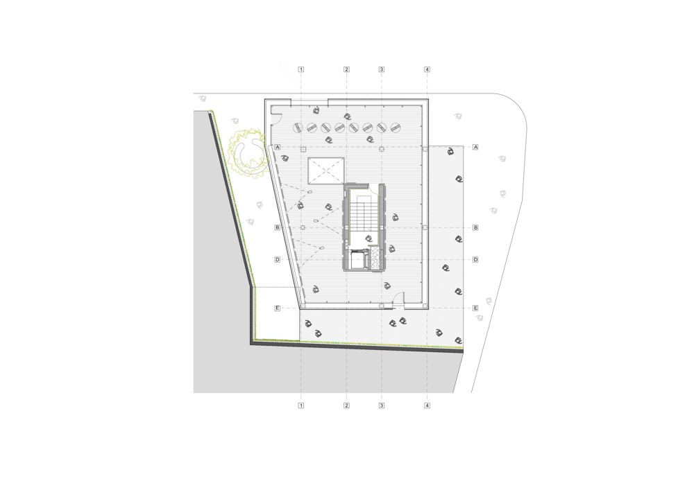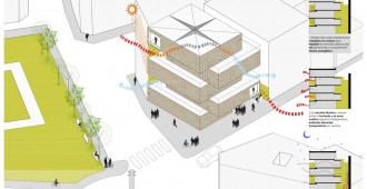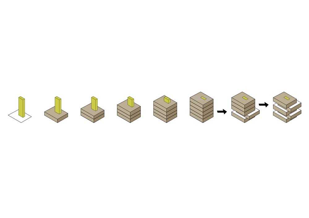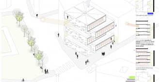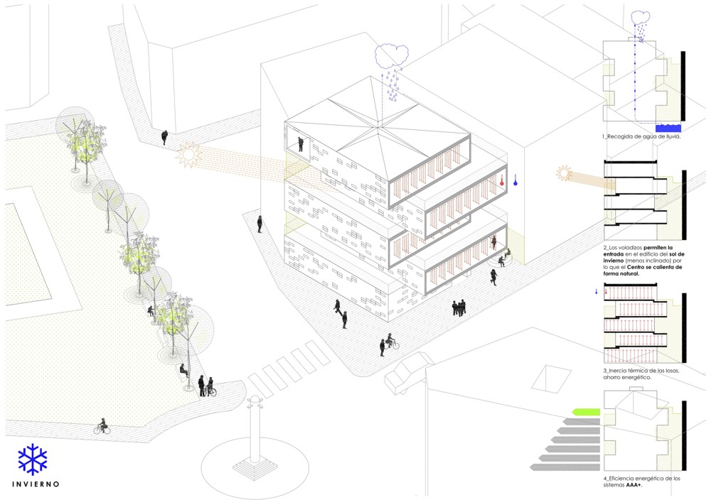Las cinco plantas de las que se compone el Centro se inscriben en cinco cajas desplazadas y colocadas unas encima de otras. Los forjados están escalonados en las áreas donde las cajas vuelan hasta el exterior para crear el efecto de una caja “sobre la otra”.
