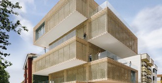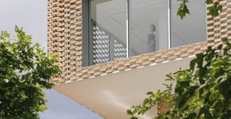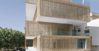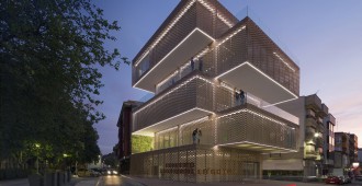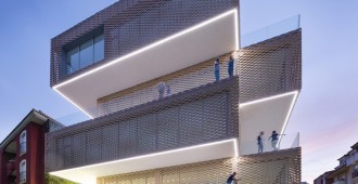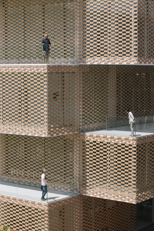 La fachada es un sistema industrializado de láminas cerámicas flexibles que cubren todo el edificio haciendo diversos dibujos que producen luces y sombras en el interior. El sistema está compuesto por un trenzado de barras de acero en la que se insertan las piezas cerámicas en retícula, lo que permite flexibilidad, polivalencia y variabilidad.