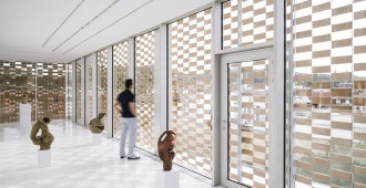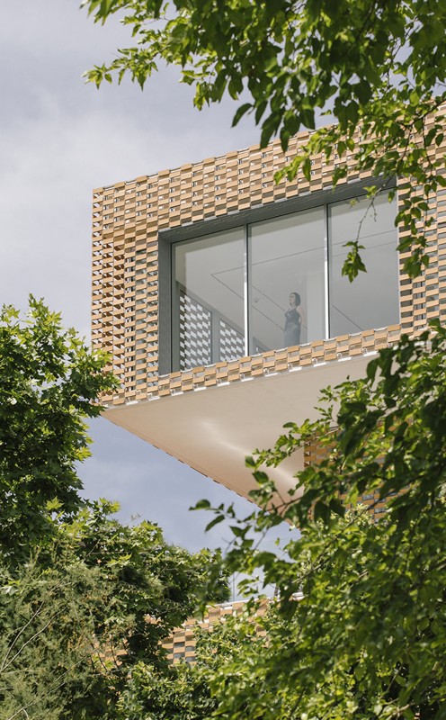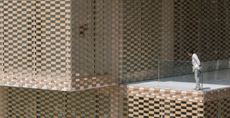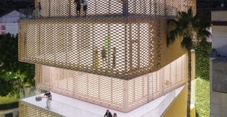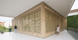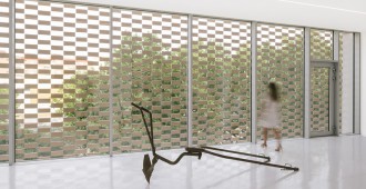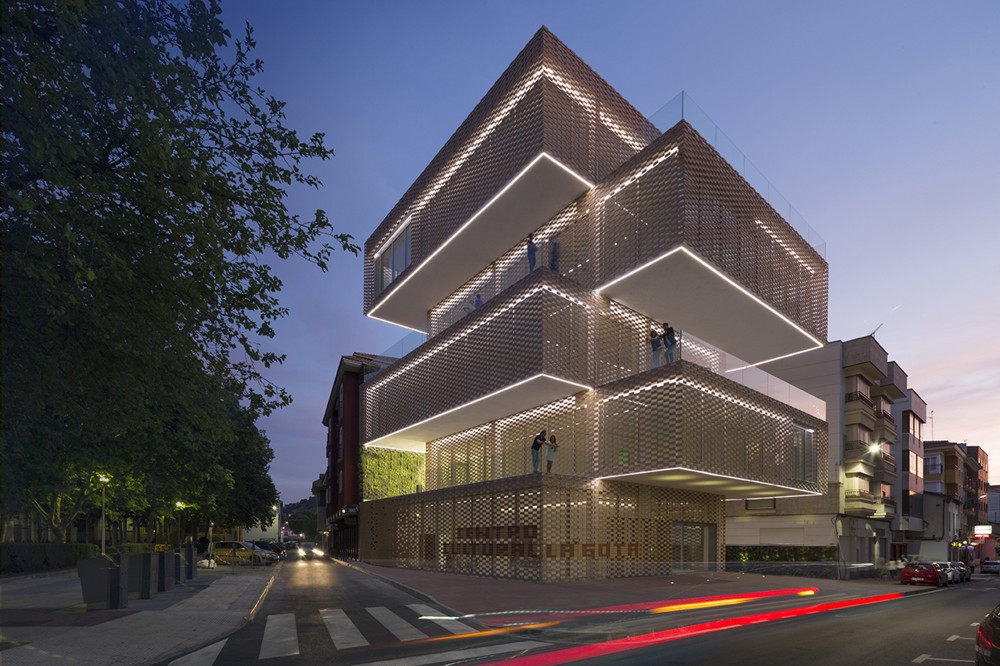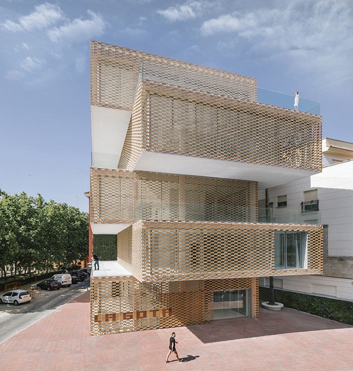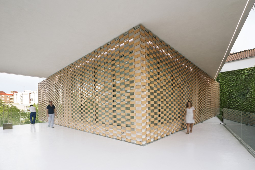La fachada se conforma de una doble piel compuesta por un muro de vidrio y el tejido cerámico denominado FLEXBRICK. Así se crea un colchón térmico que dirige las miradas desde el interior, evita el calentamiento en las épocas estivales y conforma el dibujo de los secaderos de tabaco.