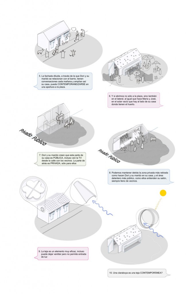 ¿Por qué no CONTEMPORANEIZAR los procesos que vemos día a día y construir un lugar de encuentro en una plaza donde no hay vida y sólo transito, donde nadie se para porque no hay sombras y está deshumanizada? ¿Qué ocurre si llevamos al kiosco la alegría de los corillos que se forman en las calles de Tetuán en verano donde los vecinos sacan sus sillas para charlas o ver la TV? Podrían ser “casas baratas” de uso social.