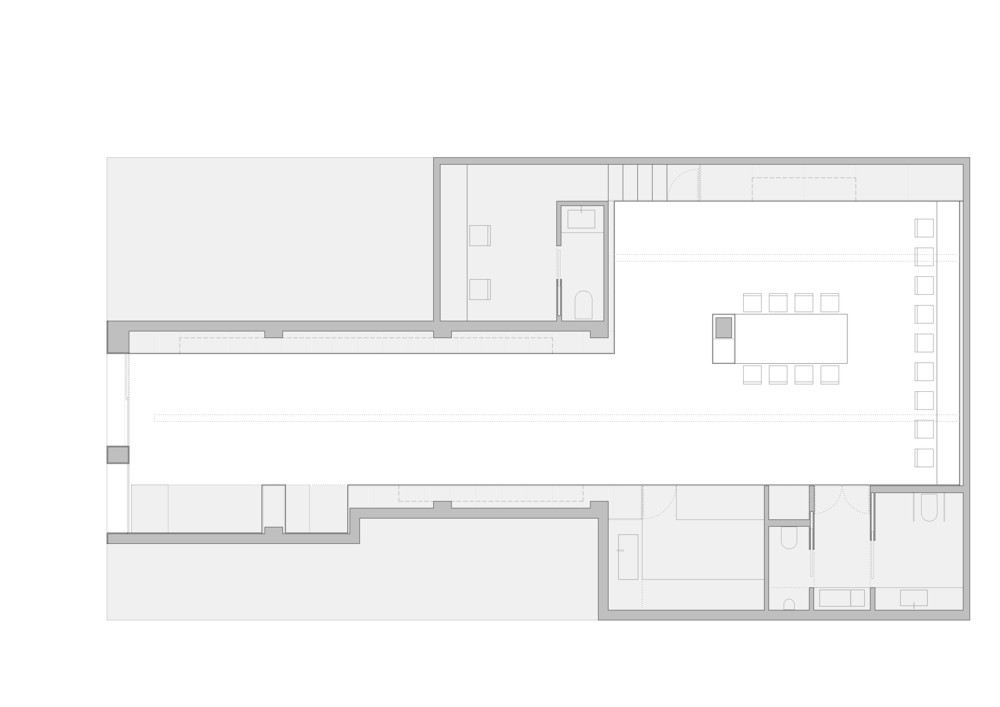 Los paramentos verticales albergan el espacio de almacenamiento y permiten regularizar la geometría del local.