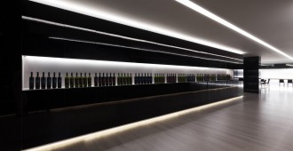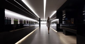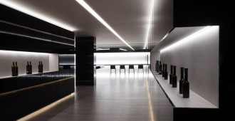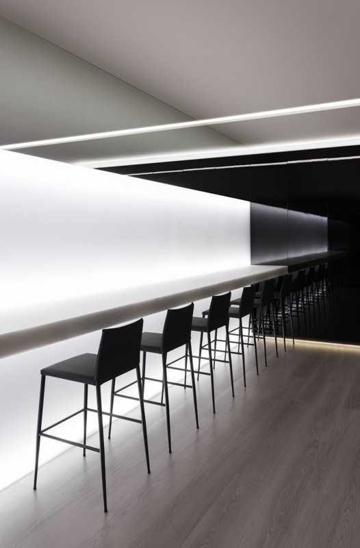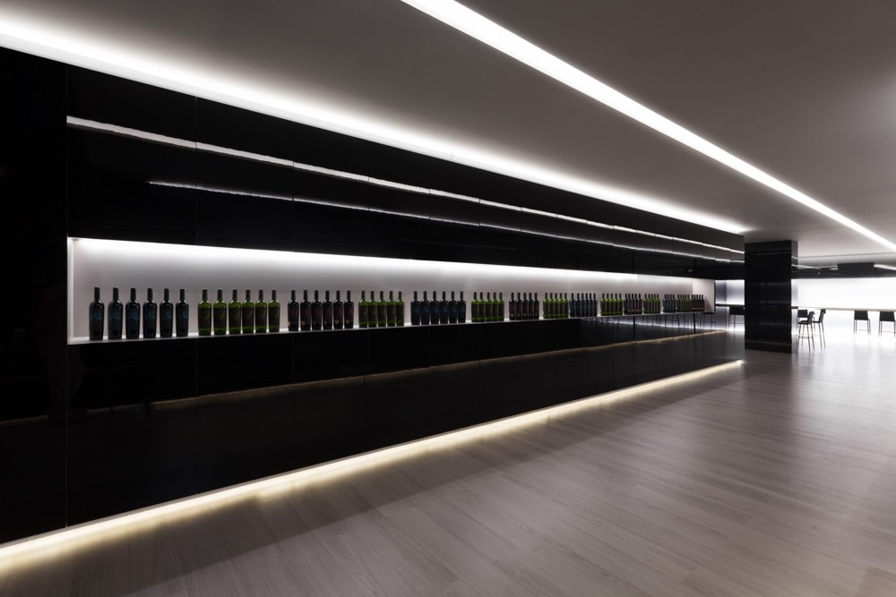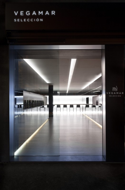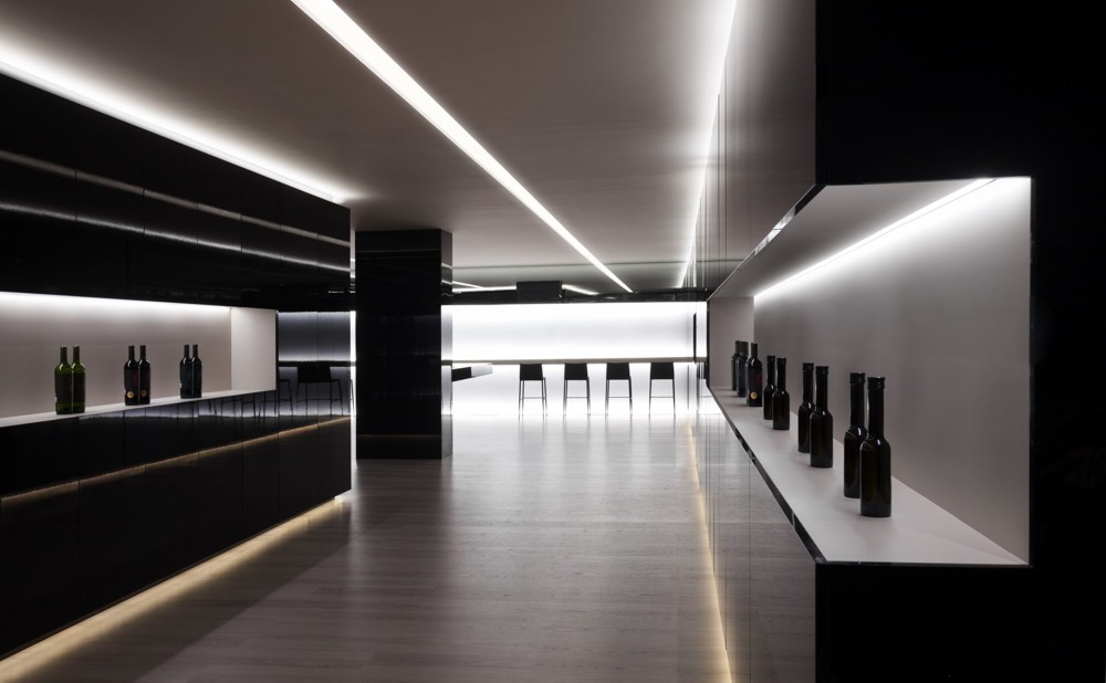 La primera zona sirve para la exposición de los productos. Dos rasgaduras horizontales en las que se presenta la línea de vinos de la bodega. Estos elementos, reforzados con la iluminación indirecta del techo, dirigen hacia el interior del local.