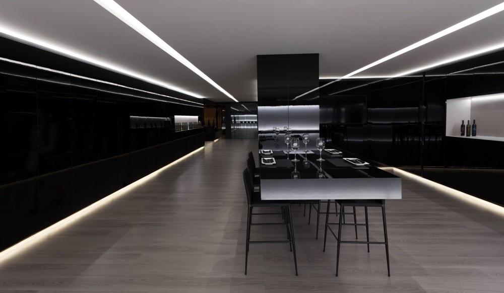 Se elige un panelado oscuro con alto brillo en los paramentos verticales. Un material que por su tonalidad y reflejos difumina los límites del local haciéndolo parecer de mayor dimensión y que hace referencia al color de los vinos que se muestran.