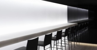 El fondo de la vinoteca se resuelve mediante un mobiliario retroiluminado, que junto al espejo superior producen la sensación de tener un espacio con mayor profundidad.